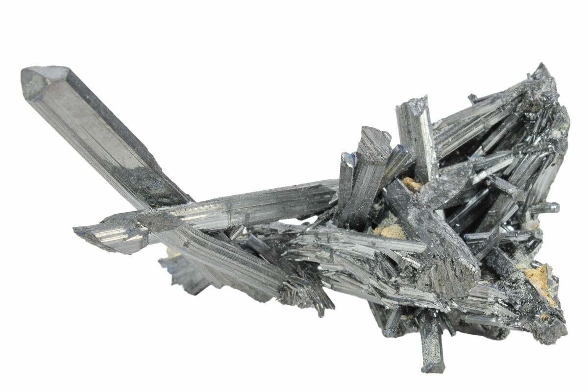 This is a 2.3" long, shiny spray of slender, metallic stibnite crystals. It is part of a new stibnite find in the Jiangxi Province of China.