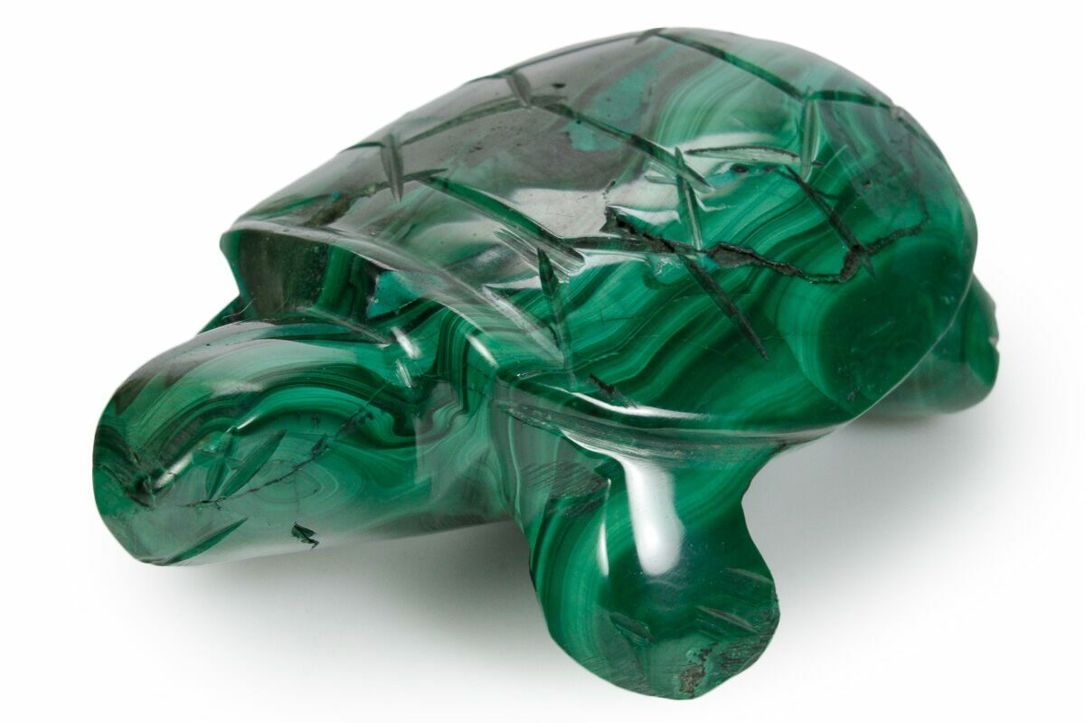 Swimming out of the ocean and crawling up your beach is this nicely carved turtle made from malachite collected from the Democratic Republic of the Congo. This is a sturdy, miniature piece that highlights the beauty of malachite with a nice, even polish. From rough mineral to polished piece, the malachite was worked by an expert craftsman to produce this statue reptile ready for display on the shelf or in the office.