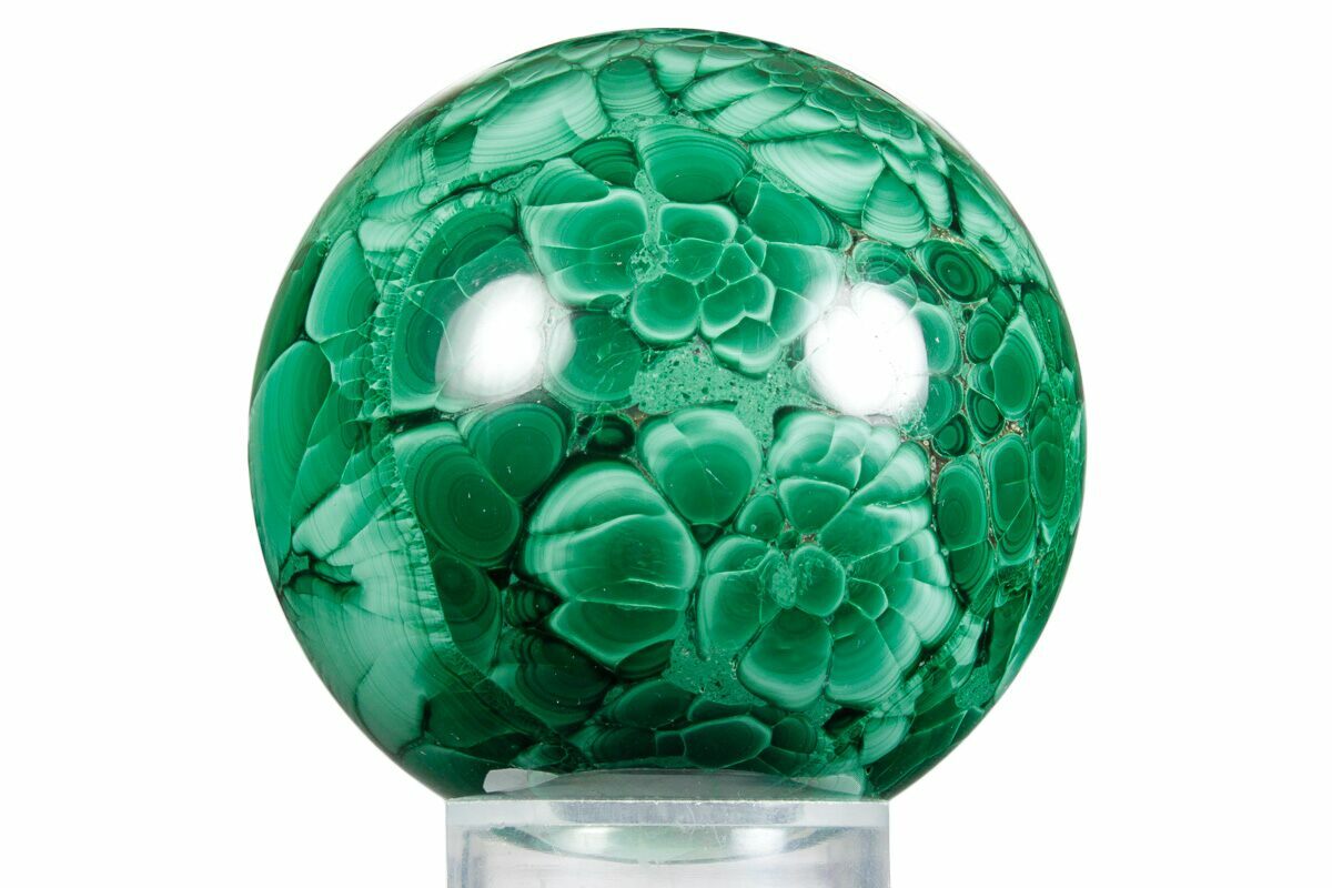 This 2.35" malachite sphere is cut from a single, solid piece with no compositing. It shows concentric and floral banding typical of malachite growth, with saturated green coloration and well-defined flow structures. The surface is uniformly polished, clearly revealing the stone’s natural mineral structure and patterning.