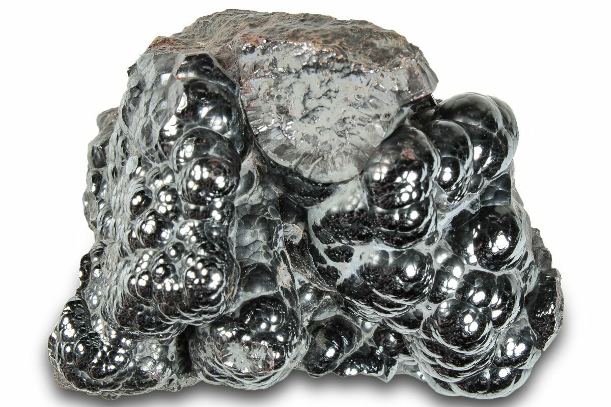 Kidney ore's globular, bubbly shape is a result of layered growth around a nucleus, such as a speck of sand or dust. As more material is deposited, the spheres grow larger and eventually overlap with other nearby spheres. They all eventually fuse together to form the botryoidal cluster.