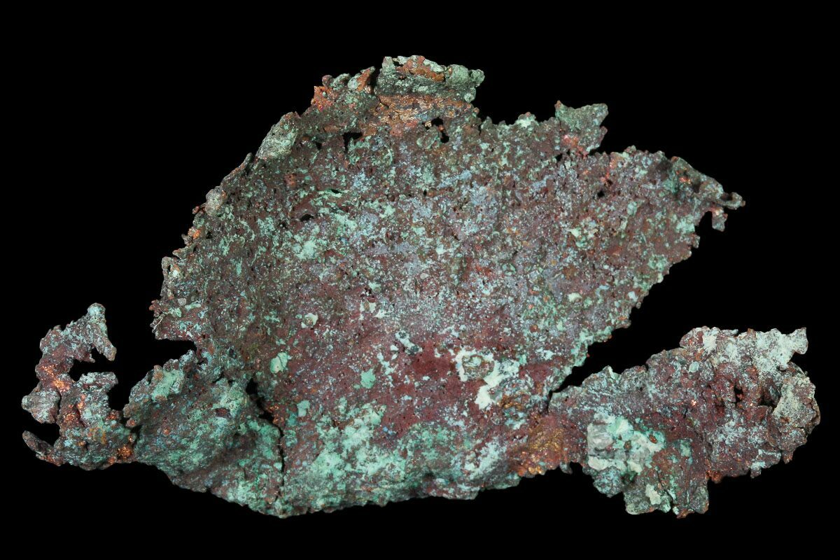 Native copper occurs rarely as isometric cubic and octahedral crystals, but more typically as irregular masses and fracture fillings. It has a reddish, orangish, and/or brownish color on fresh surfaces, but typically is weathered and coated with a green tarnish of copper carbonate.