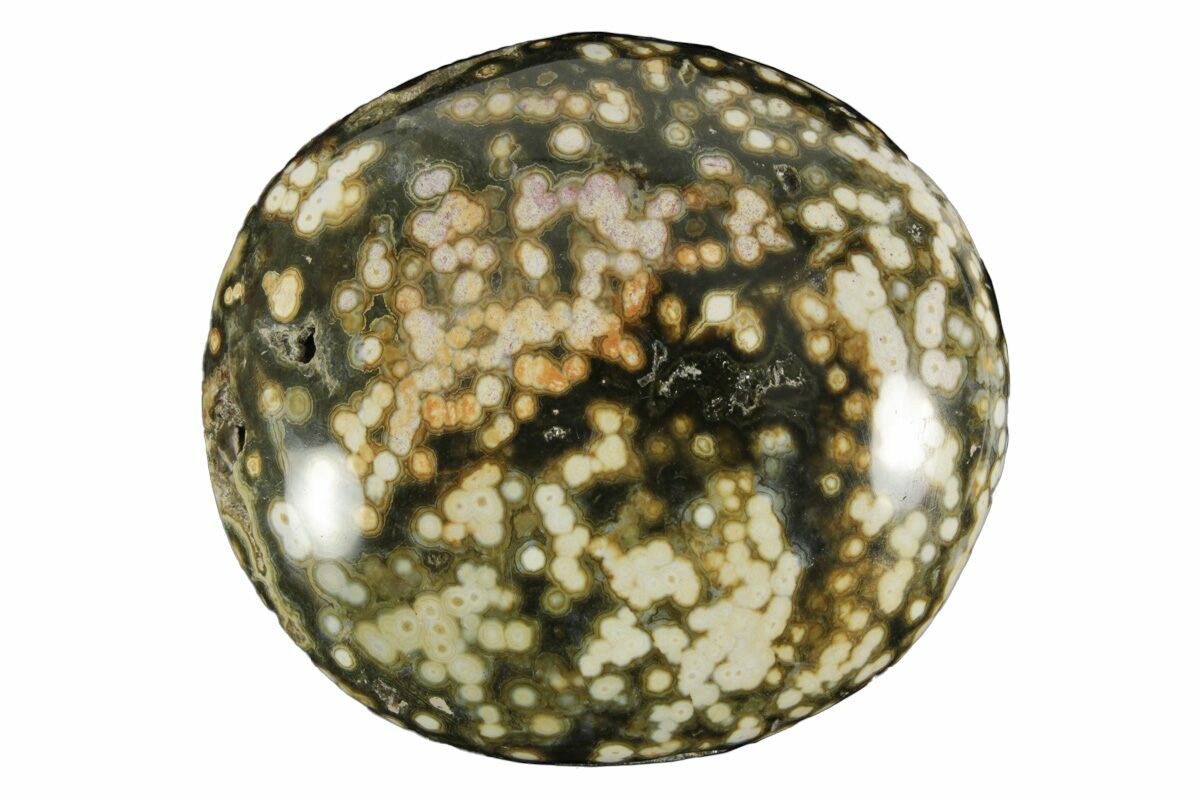 Ocean jasper is a rare type of silicified rhyolite (considered both an agate and a jasper), mined in a single location on the Ambolobozo Peninsula of northern Madagascar. The deposits are found on the coastline, hence the name, and can only be reached by boat and mined during low tide. The deposit formed as a rhyolite flow, but has been completely silicified. The rhyolitic eyes or orbs come in an astonishing array of colors and color combinations. The backgrounds can be white, pink, green, red, or yellow. Botryoidal formations as well as white and deep green druzy are also common.