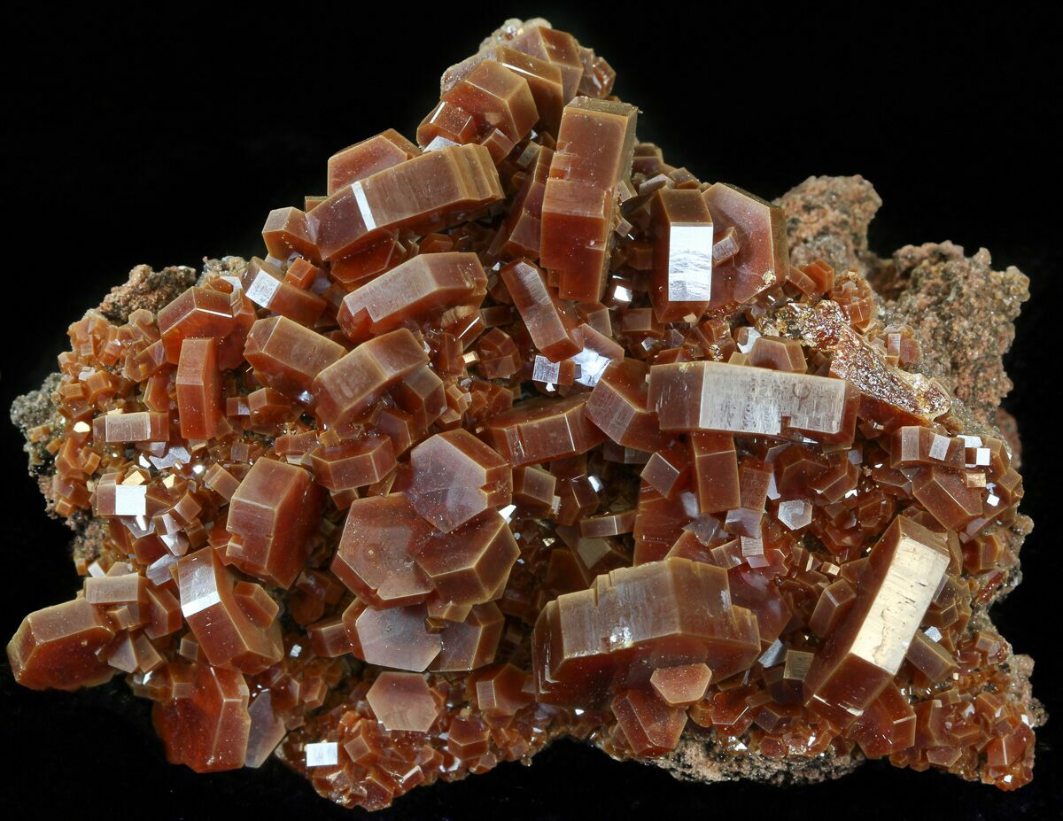 This is a beautiful grouping of large deep red and light brown, vanadinite crystals from Midelt, Morocco. They exhibit excellent color saturation, and a mirror luster on an iron-rich matrix. This specimen is a cluster of hundreds of both small and large, high quality crystals.