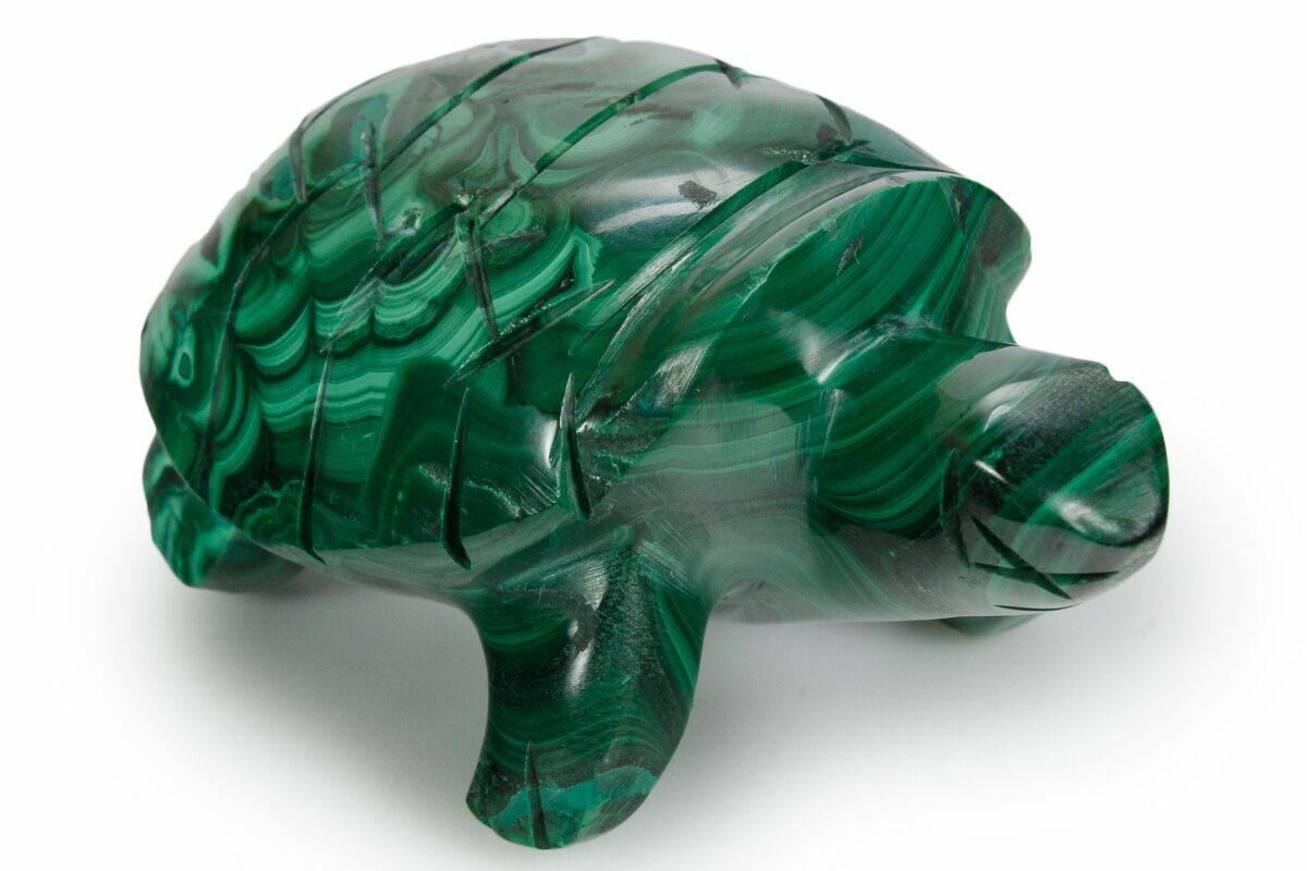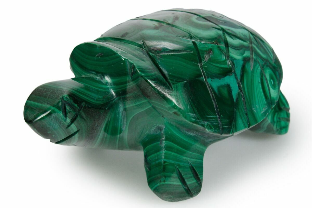 Swimming out of the ocean and crawling up your beach is this nicely carved turtle made from malachite collected from the Democratic Republic of the Congo. This is a sturdy, miniature piece that highlights the beauty of malachite with a nice, even polish. From rough mineral to polished piece, the malachite was worked by an expert craftsman to produce this statue reptile ready for display on the shelf or in the office.