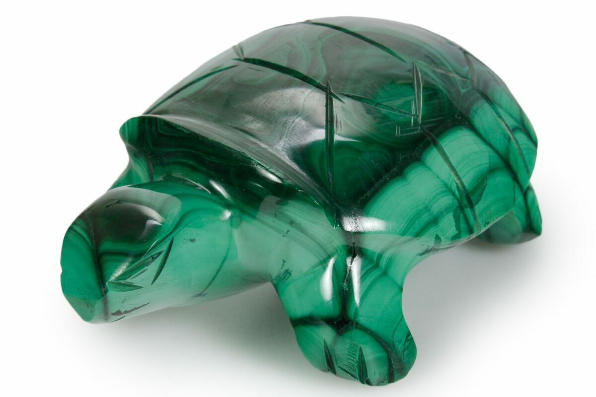 Swimming out of the ocean and crawling up your beach is this nicely carved turtle made from malachite collected from the Democratic Republic of the Congo. This is a sturdy, miniature piece that highlights the beauty of malachite with a nice, even polish. From rough mineral to polished piece, the malachite was worked by an expert craftsman to produce this statue reptile ready for display on the shelf or in the office.