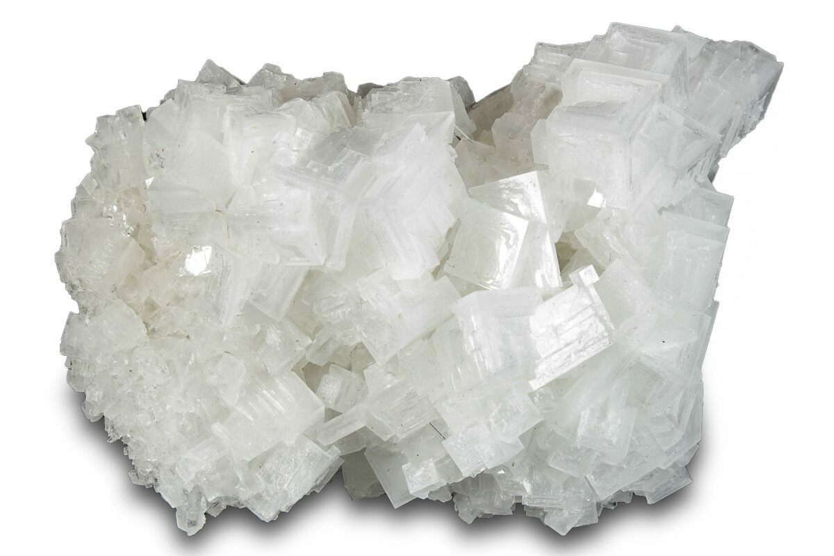 Halite, more commonly known as rock salt, is a form of the mineral sodium chloride (NaCl). It forms when salt-rich waters evaporate and can be colored by mineral impurities.