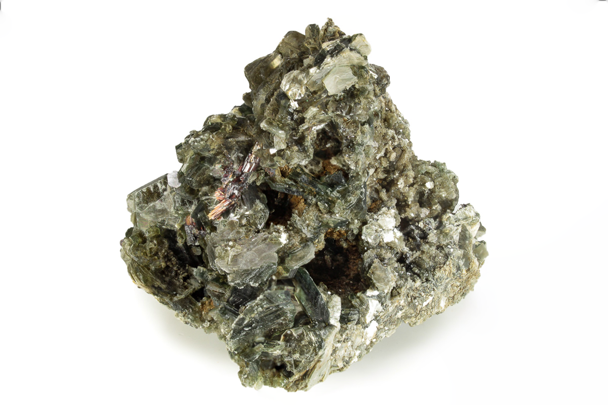 Here is a beautiful cluster of muscovite crystals, collected from Adams farm in Alexander County, North Carolina. The specimen measures 2.4" wide and the muscovite crystals exhibit an eye catching luster. Vibrant red rutile crystals can be found intertwined with the muscovite crystals