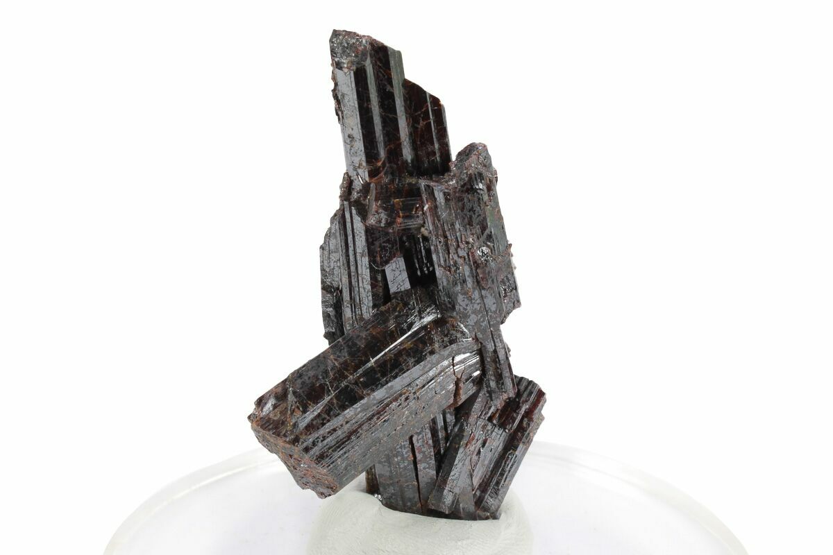 This is a 2.4" wide, red-brown rutile crystal cluster collected from a site near McGregor Lake in Québec, Canada. The rutile exhibits a brilliant luster and has been mounted to an acrylic display base with mineral tack.