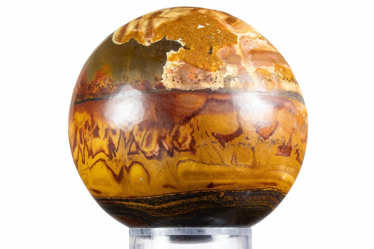 This is a beautiful, 2.4" wide polished sphere of Marra Mamba tiger's eye from Mt. Brockman in Western Australia. It is accompanied by an acrylic ring display stand.
