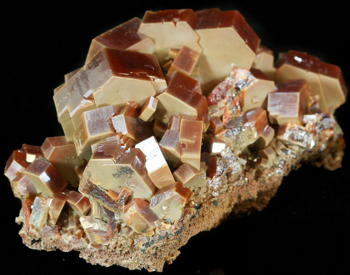 This is a beautiful grouping of huge deep red and light brown, vanadinite crystals from Midelt, Morocco. They exhibit excellent color saturation, and a mirror luster on an iron-rich matrix. This specimen is a cluster of large, high quality crystals.