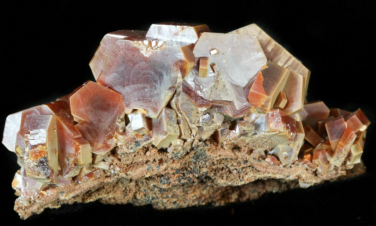 Vanadinite from Morocco is world-famous for producing some of the finest red crystal specimens on the planet. In the arid hills surrounding Mibladen and Taouz, vanadinite forms as vibrant clusters of hexagonal prisms, often with a deep crimson to orange-red color that seems to glow against the pale desert matrix. These crystals typically develop in dense groups, coating barite blades or covering weathered limestone with dazzling, glassy faces and sharp geometric symmetry. The dryness of the region and the slow oxidation of ancient lead deposits create the perfect geochemical environment for vanadinite to grow with exceptional clarity, luster, and intensity of color. Moroccan vanadinite is highly prized by collectors for its bold aesthetics, architectural crystal formations, and the consistent quality that has made these localities the global benchmark for the species.