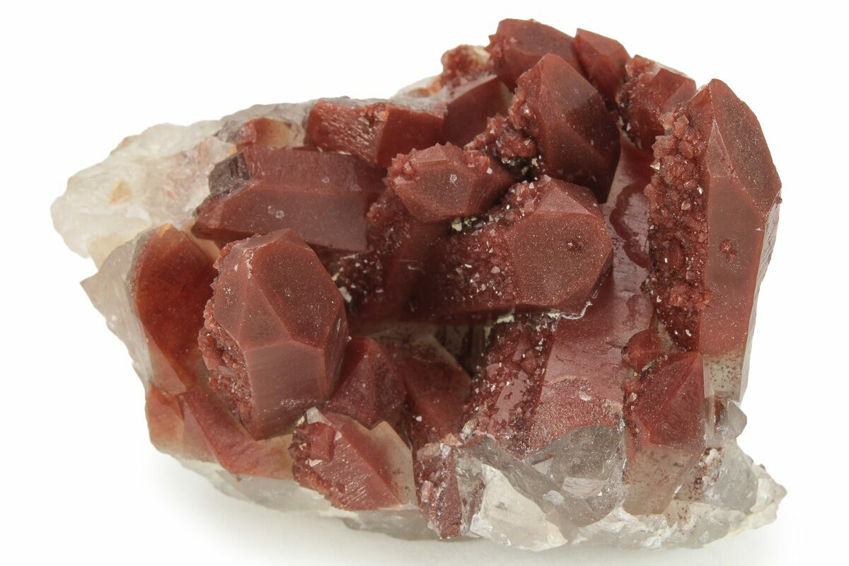 This is a top-quality cluster of natural red quartz crystals from Tinejdad, Morocco. The red coloration is due to iron oxidation across the exterior of the crystals, as well as inclusions through the crystals.