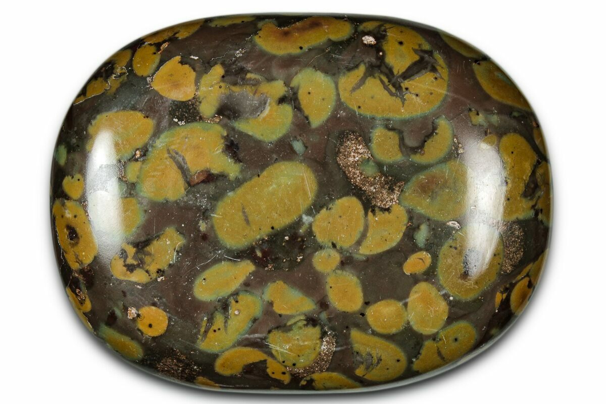 This vibrant piece of Fruit Jasper—also known as Ajooba Jasper or Sabalgarh Marble—features a striking mosaic of red, yellow, green, khaki, and brown nodules set within a warm buff-to-beige matrix. Its lively, “fruit-mix” appearance comes from clusters of rounded inclusions that resemble pistachios or berries embedded in stone—and in many cases, these nodules actually contain tiny fossil fragments such as crinoid stem pieces and other bioclastic debris from the ancient seafloor. These remnants of marine life add an unexpected paleontological twist to the stone’s already eye-catching patterning, making each piece even more visually unique.