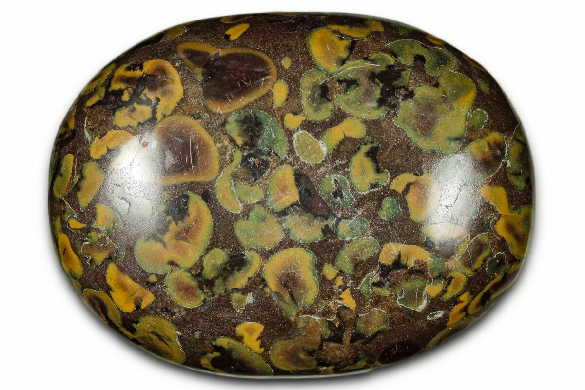 This is a beautifully polished, 2.4" wide fruit jasper palm stone, gleaming with warm hues and intricate natural patterning. Its smooth finish and eye-catching color palette make it a small yet stunning display piece.
