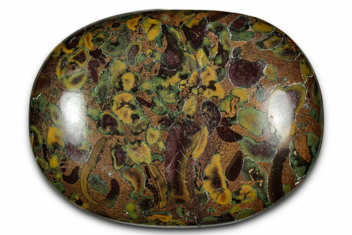 This vibrant piece of Fruit Jasper—also known as Ajooba Jasper or Sabalgarh Marble—features a striking mosaic of red, yellow, green, khaki, and brown nodules set within a warm buff-to-beige matrix. Its lively, “fruit-mix” appearance comes from clusters of rounded inclusions that resemble pistachios or berries embedded in stone—and in many cases, these nodules actually contain tiny fossil fragments such as crinoid stem pieces and other bioclastic debris from the ancient seafloor. These remnants of marine life add an unexpected paleontological twist to the stone’s already eye-catching patterning, making each piece even more visually unique.