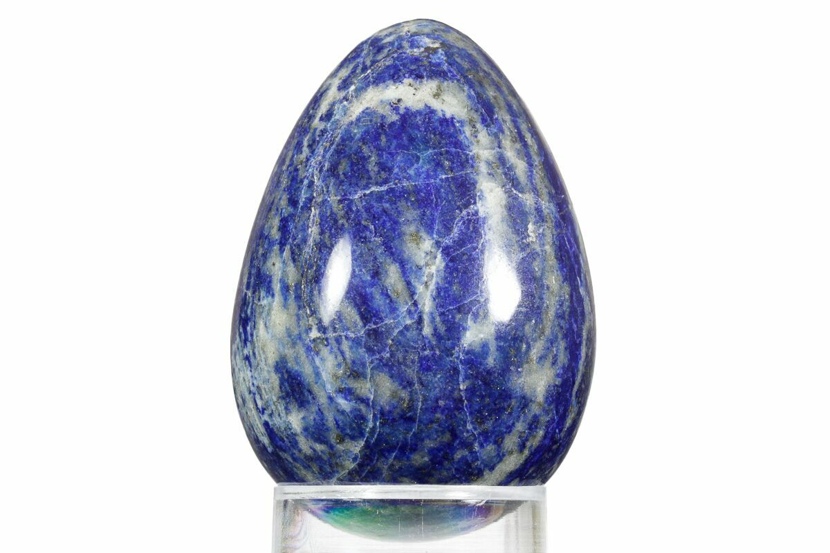 This is a 2.4" tall, polished lapis lazuli egg with streaks of sparkling pyrite running through it. The vibrant blue stone was mined from Northern Pakistan. It comes with the pictured display stand.