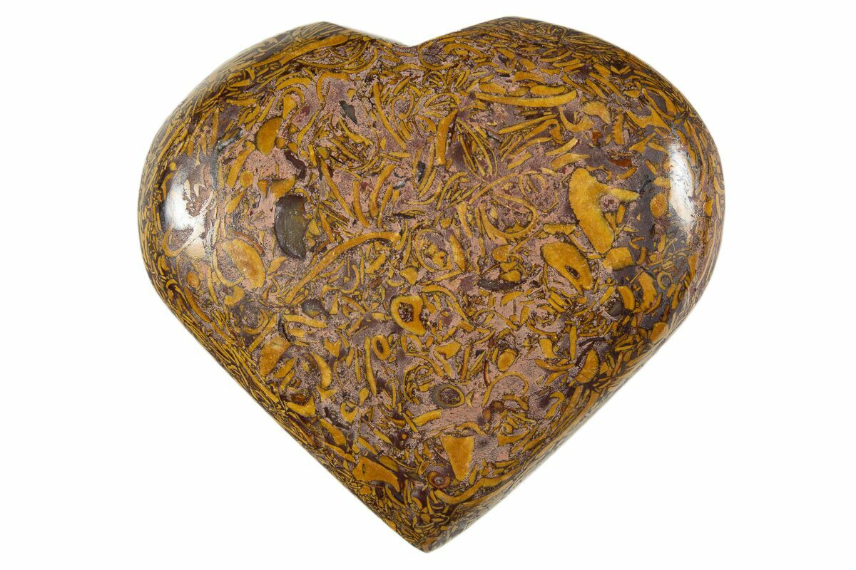 This is a beautiful, 2.4" wide polished heart made from Miriam (coquina) jasper from the Himalayan Mountains of India. The high-gloss polishing is wonderful and really brings out the intricate details of the shell fossils.
