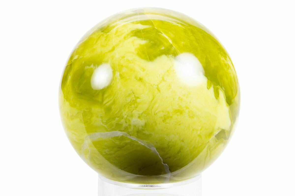 This is a 2.4" wide polished sphere crafted from richly colored Noble Serpentine mined in Northeastern Washington. It displays beautiful pistachio green swirls and a flawless polish all the way around.