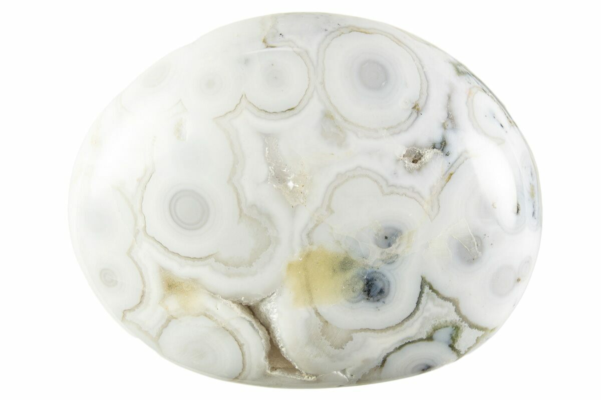 Ocean jasper is a rare type of silicified rhyolite (considered both an agate and a jasper), mined in a single location on the Ambolobozo Peninsula of northern Madagascar. The deposits are found on the coastline, hence the name, and can only be reached by boat and mined during low tide. The deposit formed as a rhyolite flow, but has been completely silicified. The rhyolitic eyes or orbs come in an astonishing array of colors and color combinations. The backgrounds can be white, pink, green, red, or yellow. Botryoidal formations as well as white and deep green druzy are also common.