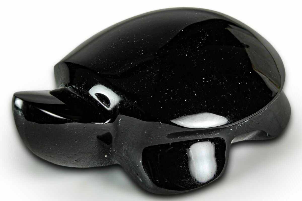 This is a 2.4" long turtle sculpted from rainbow obsidian. This interesting stone is mined from La Revoltosa Mine near San Andreas, Jalisco, Mexico. The obsidian exhibits a colorful chatoyant effect that changes when viewed from different angles. A beautiful green to yellow color can be seen on the top of the turtle when placed under a light source.