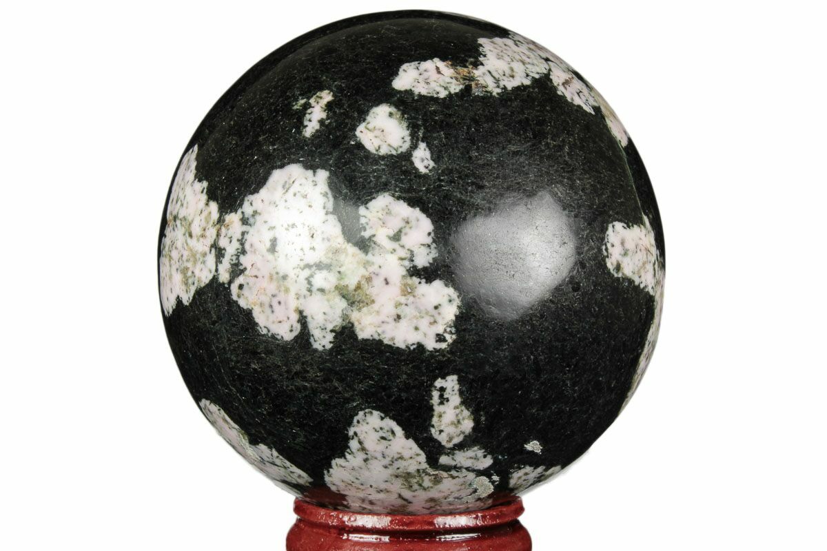 This is a 2.4" wide polished sphere made from Pakistan snowflake stone. It comes with a small acrylic ring stand.