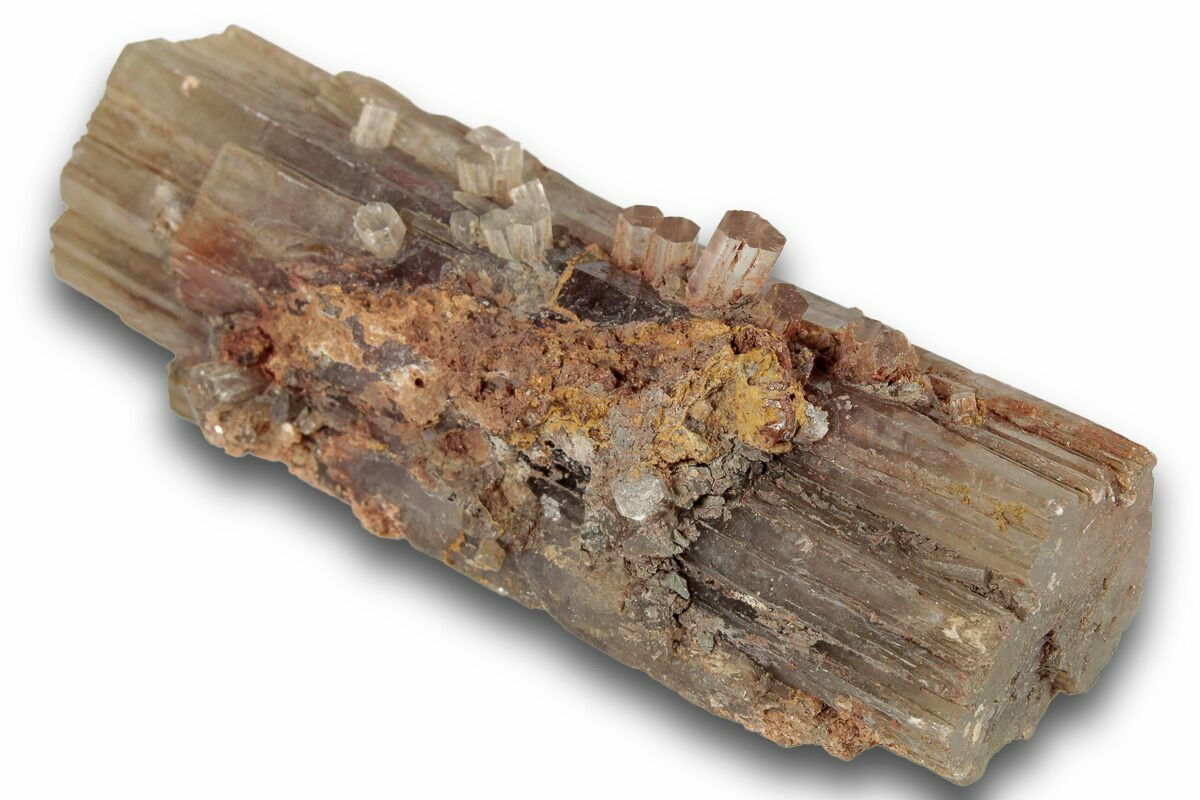 Aragonite is one of two common calcium carbonate (CaCO3) minerals: the other is calcite. Aragonite is a pseudomorph after calcite: its crystal lattice differs from calcite, resulting in a different crystal shape. It displays a translucent to white color when pure, and when impure can vary between yellow, green, pink, blue and brown. It typically forms in low-temperature hydrothermal veins, in hot springs, and as precipitates from chemicals in sedimentary rock. It can also form under biological processes: aragonite forms naturally in most mollusk shells, and as the calcareous endoskeleton most corals.