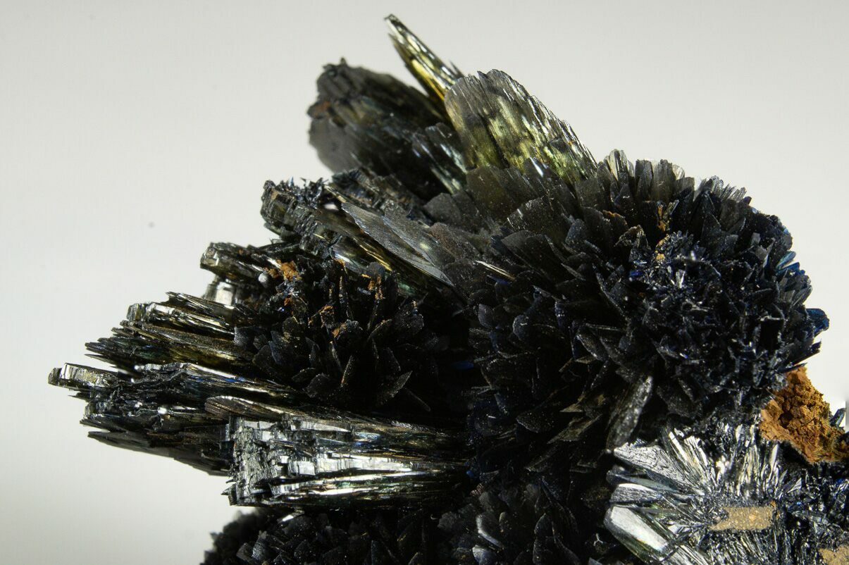 This is a cluster of radiating, very dark-green Vivianite crystals on an oolitic limonite matrix. These from the Kerchenskoe Mine on the Crimea Peninsula.