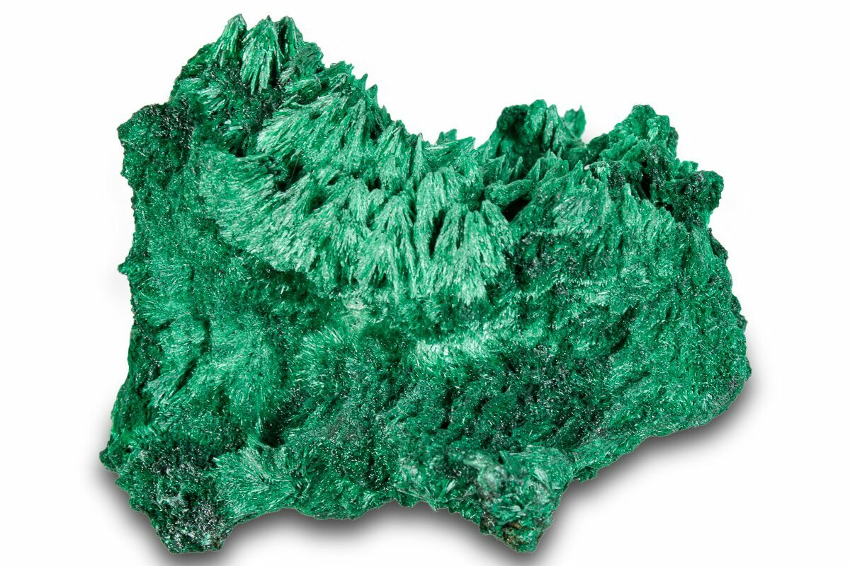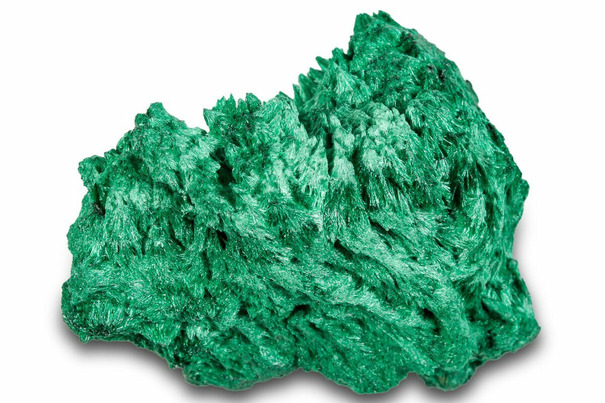 Malachite is an intense green copper-based mineral that can be found in a wide variety of forms. Malachite can grow in botryoidal masses, stalactitic formations, and reniform formations, typically as a tight cluster of fanning fibrous needles that make up a seemingly solid mass. As layers continue to stack during formation, banded patterns can sometimes begin to take shape, explaining the rings in all shades of green seen on most polished malachite specimens.