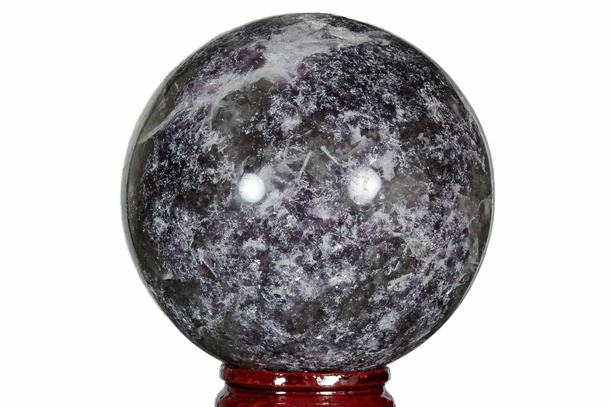 This is a 2.4" wide, polished sphere of sparking, purple Lepidolite from Madagascar. It comes with a wooden display stand for secure, aesthetic display.