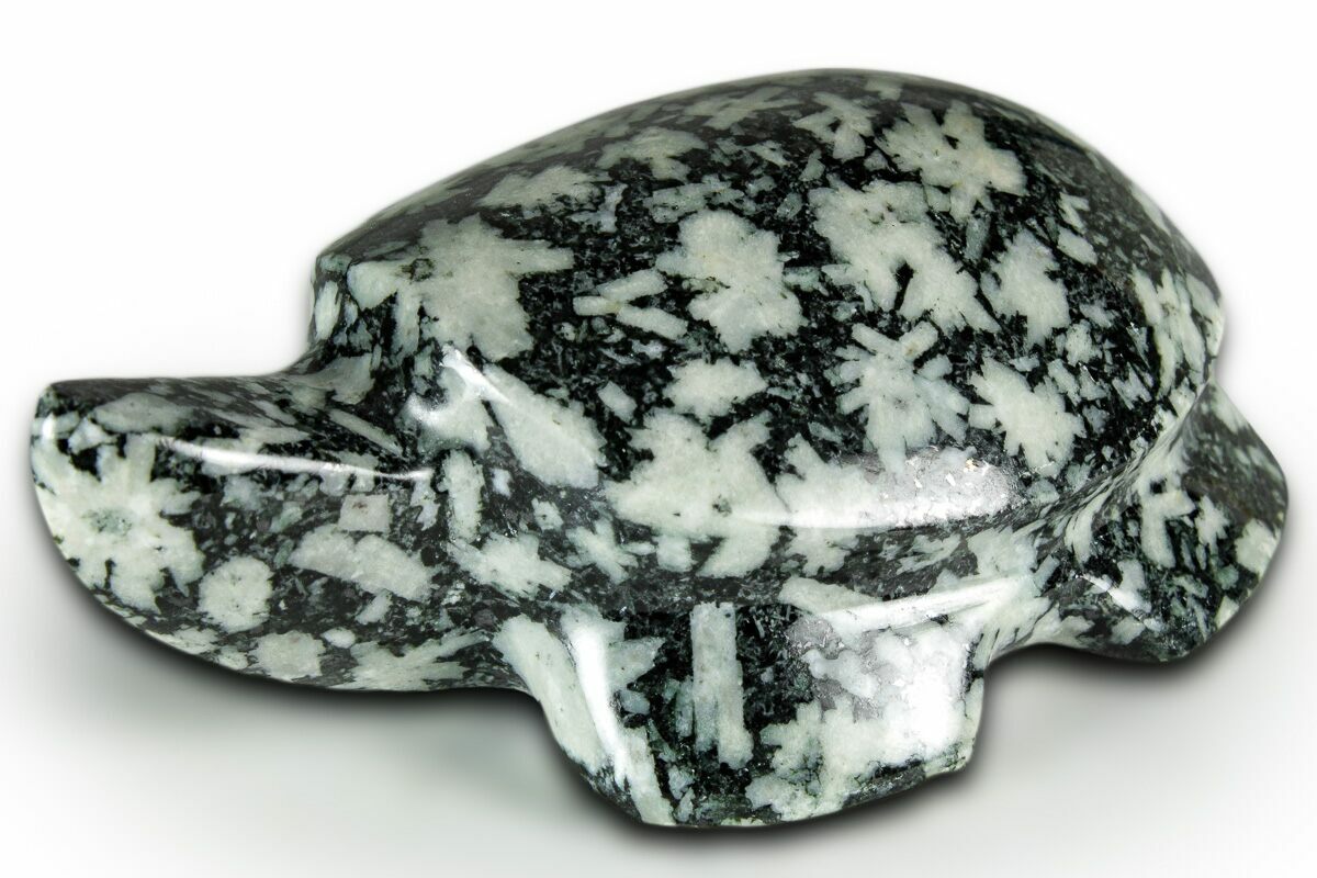 This is a beautiful polished turtle sculpture carved from a piece of Chinese writing rock. This little guy measures 2.45 inches long and the glossy polish really brings out the intricate details of the feldspar.