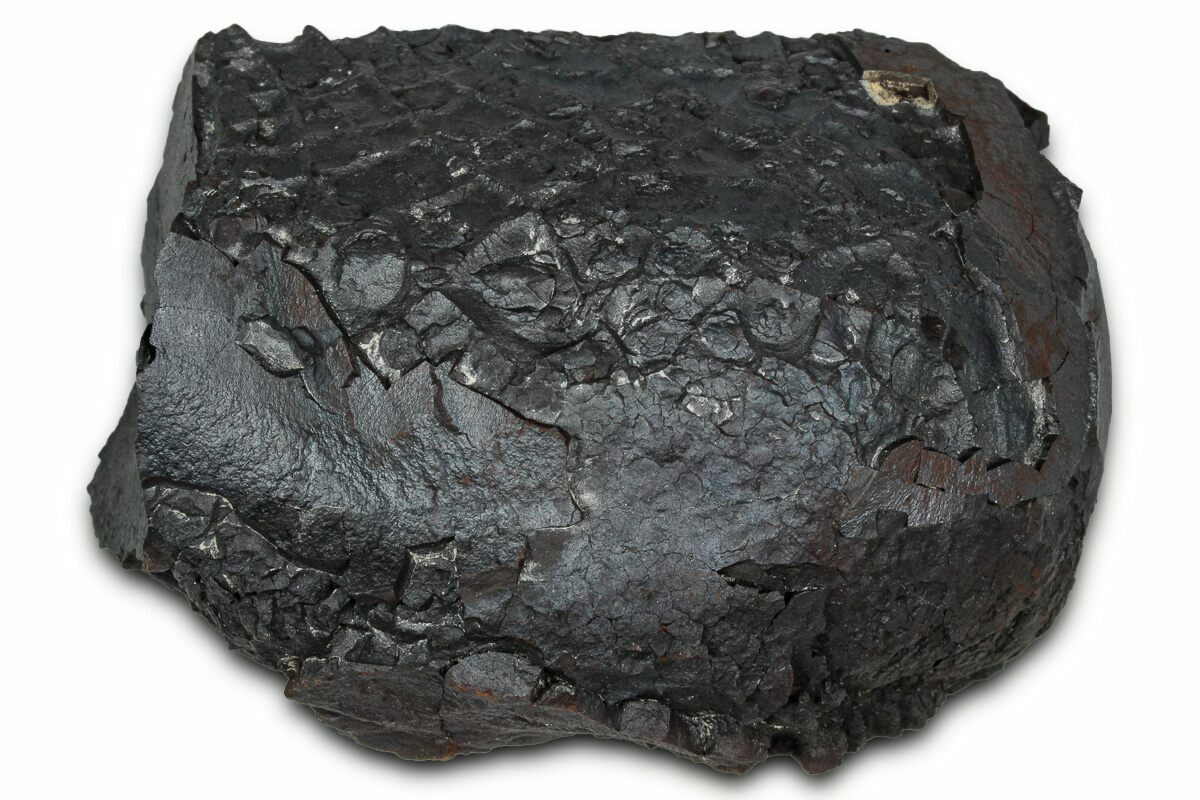 Dragon scale stone is the trade name of this type of iron nodule found in the Hell Creek Formation of North Dakota. They are found alongside dinosaur bones throughout the Hell Creek deposits, often lying next to dinosaur remains. Despite their name, these stones have nothing to do with dragons aside from their unique polygonal patterning, reminiscent of dragon scales. Their composition is primarily iron oxide with a siderite core and manganese/iron oxides that give them their dark red-brown patina.
