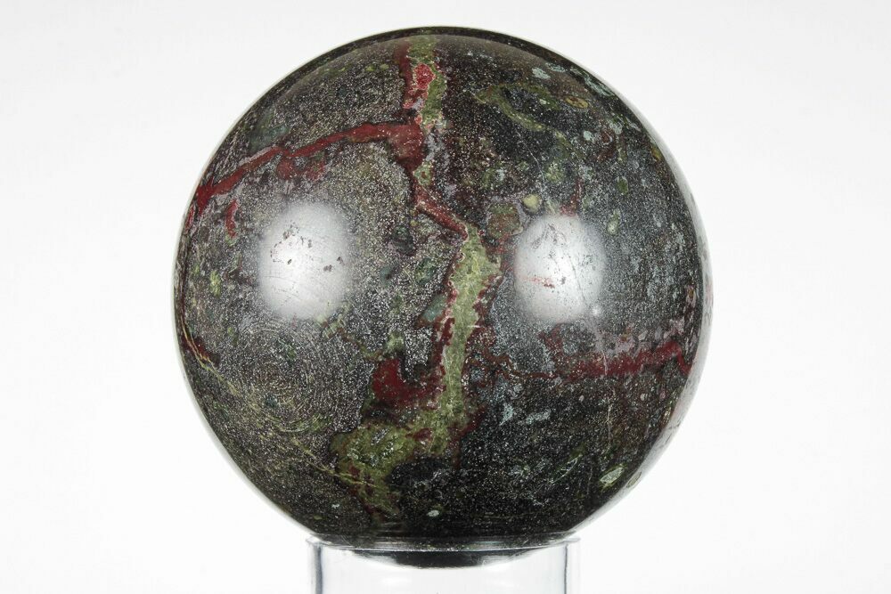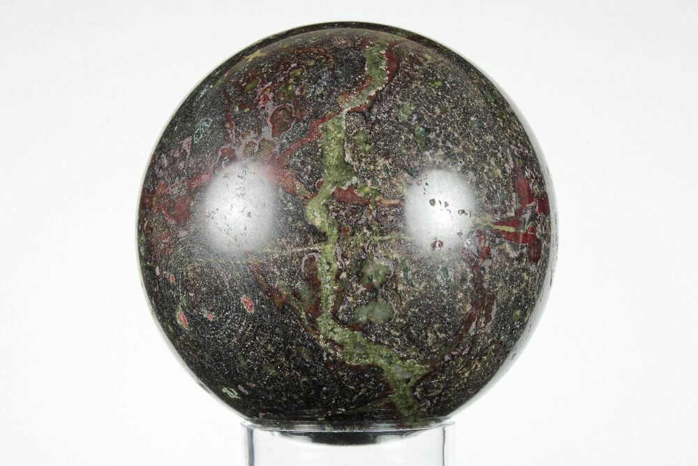 This is an polished sphere made out of Dragon's Blood Jasper from South Africa. It measures 2.45" in diameter and comes with the pictured display stand.