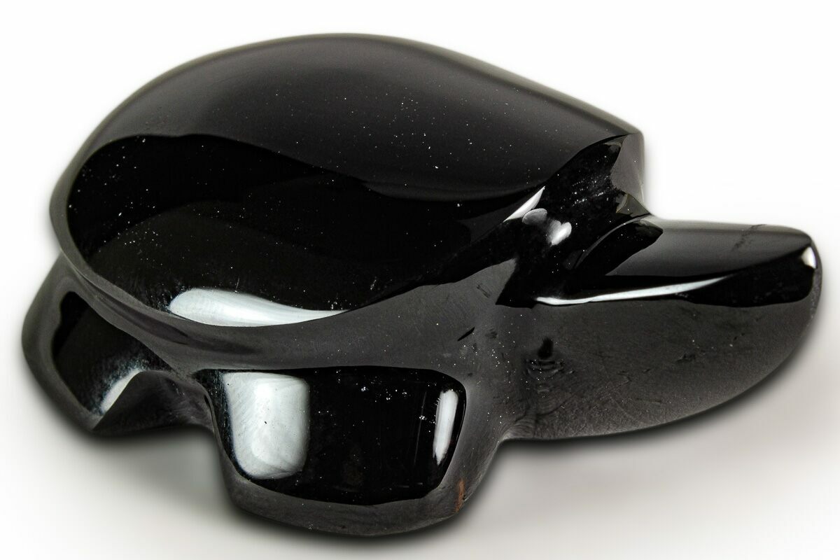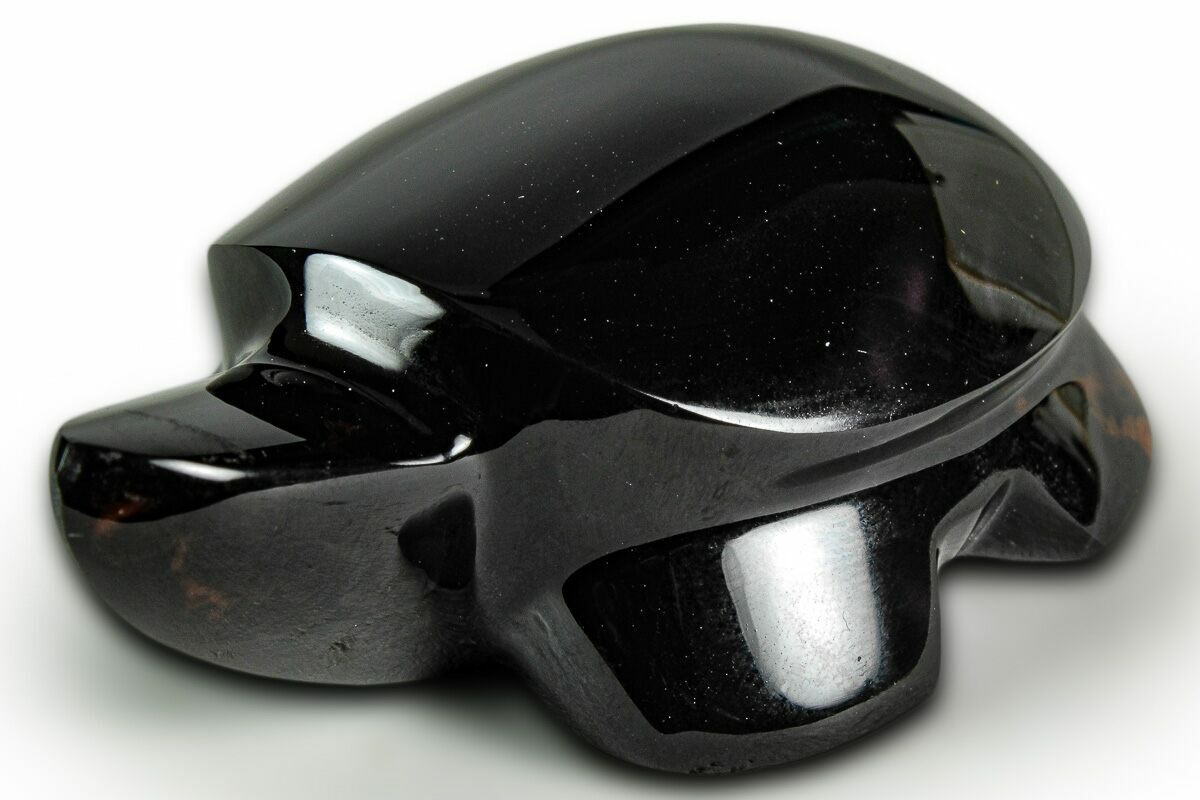 This is a 2.45" long turtle sculpted from "sheen" obsidian, collected near Davis Creek, Northern California. The obsidian has been flawlessly polished to a glossy finish. It has chatoyant swirls throughout the stone that appear when placed under a light.
