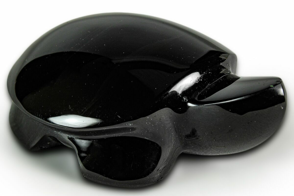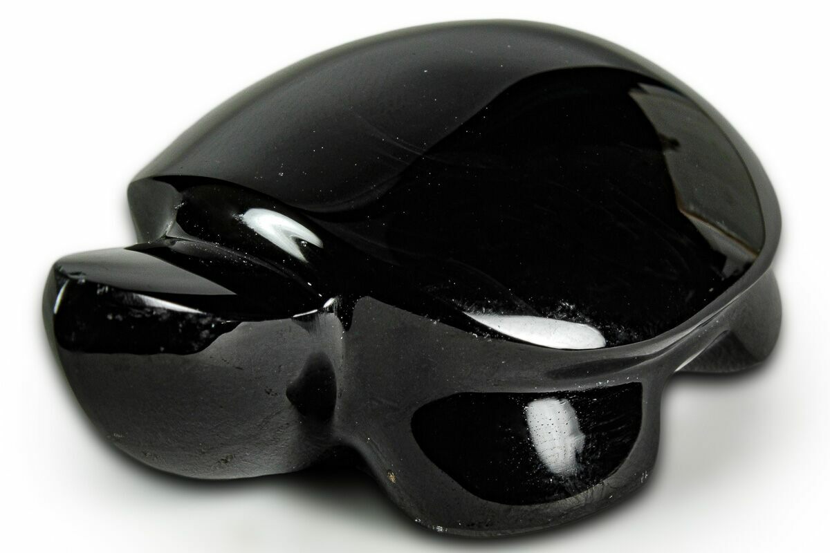 This is a 2.45" long turtle sculpted from "sheen" obsidian, collected near Davis Creek, Northern California. The obsidian has been flawlessly polished to a glossy finish. It has chatoyant swirls throughout the stone that appear when placed under a light.