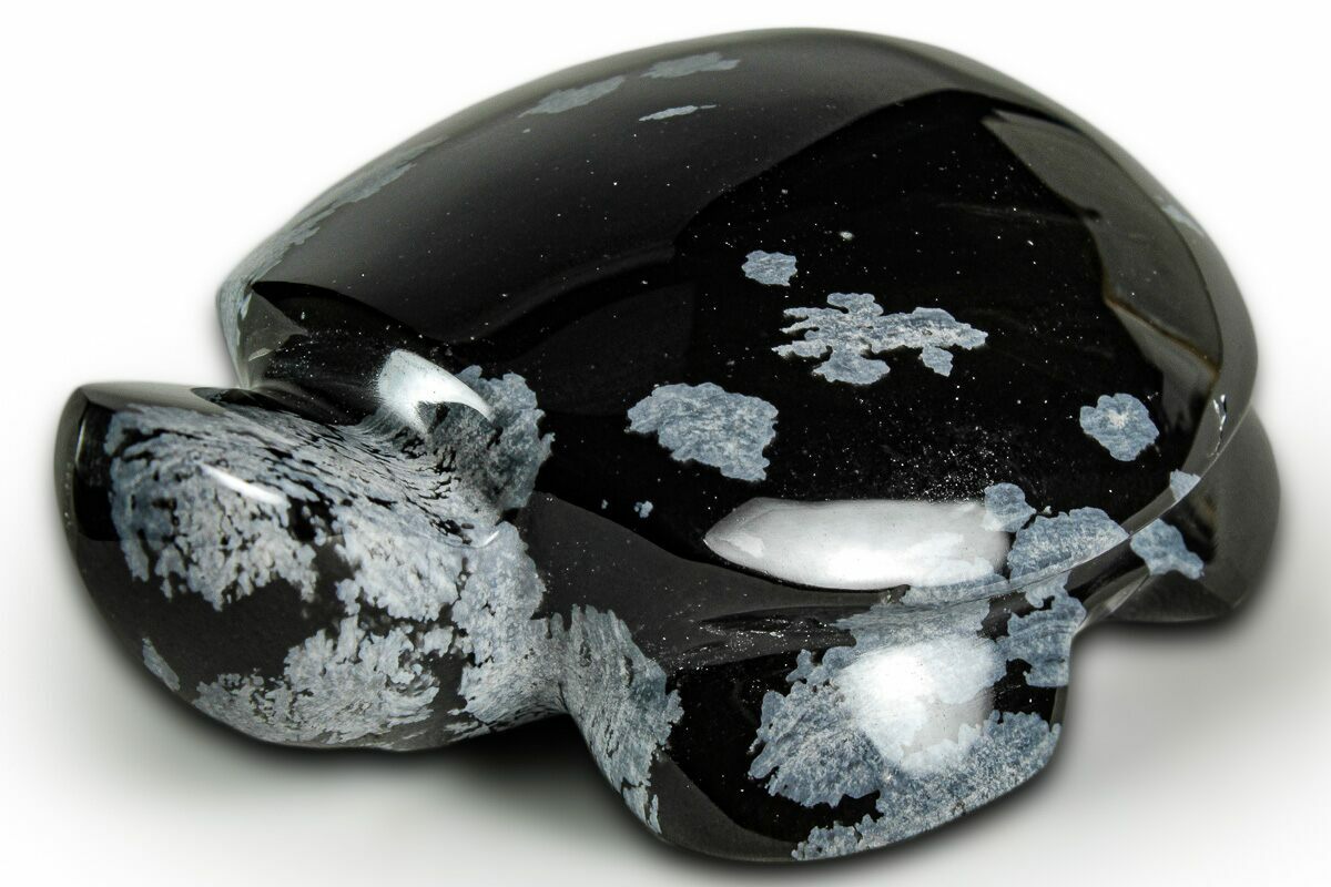 This is a 2.45" long turtle sculpted from snowflake obsidian, collected near Sevier Lake in Millard County, Utah. The obsidian has been flawlessly polished to a glossy finish.