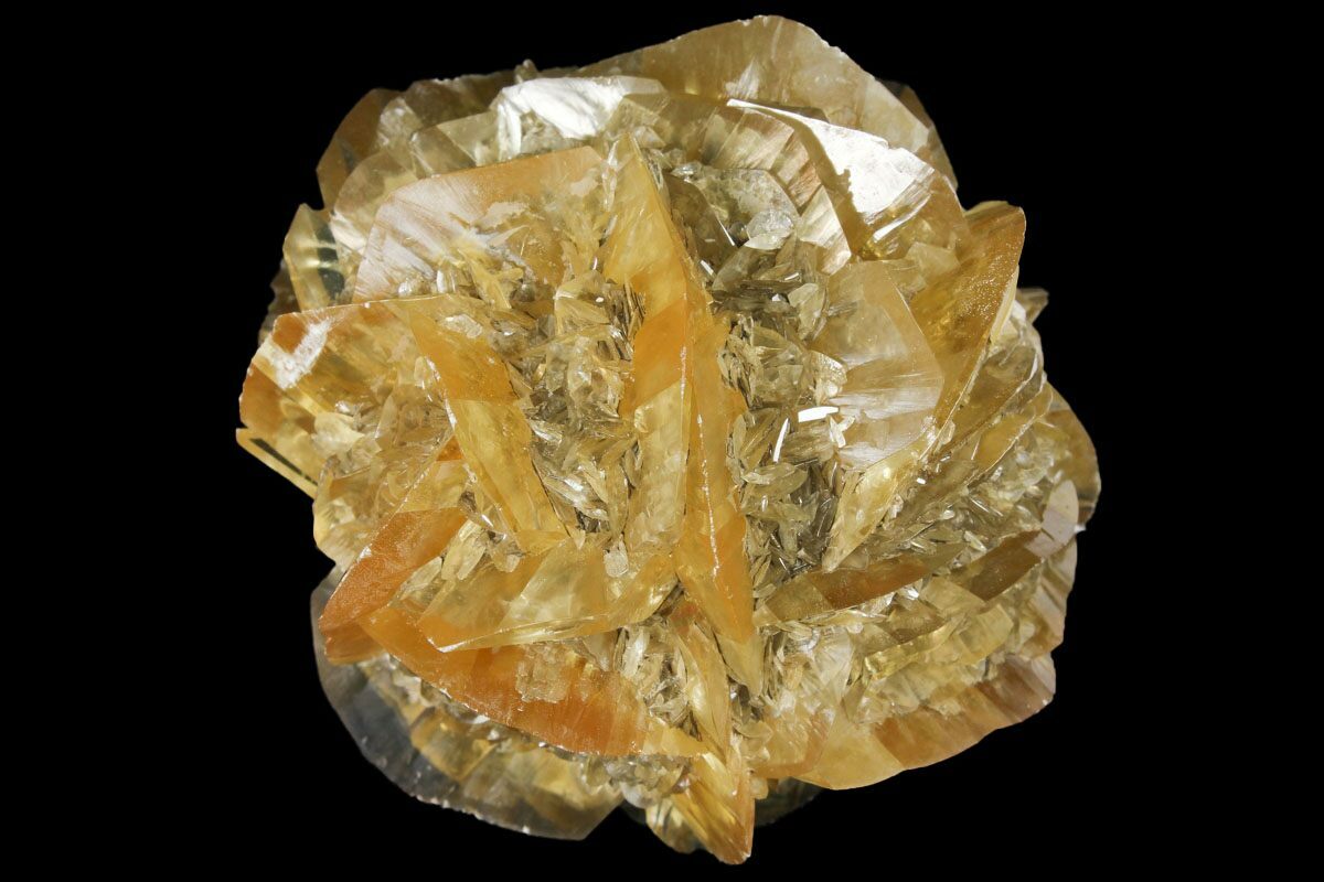 This is a classic Canadian mineral specimen from the Red River Floodway deposits in Manitoba, Canada. It's a selenite ball covered in gemmy, pale yellow, selenite crystals. The entire piece measures 2.45" wide. The crystals are highly fluorescent under short wave UV, and emits phosphorescent light that remains several seconds after the UV light is turned off.