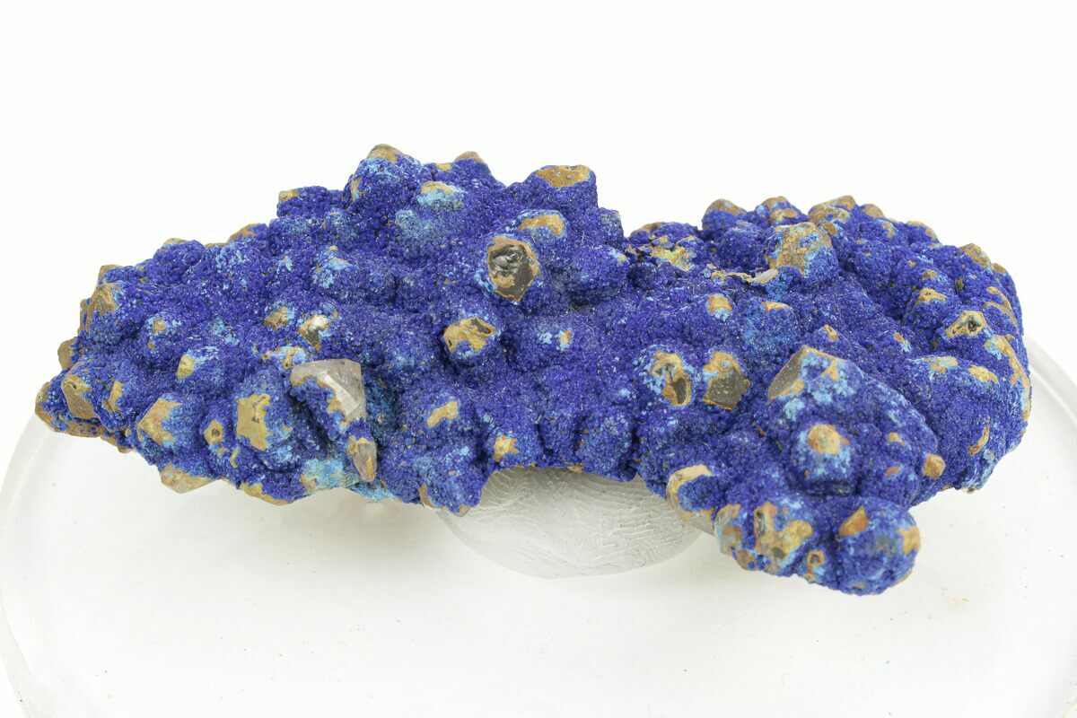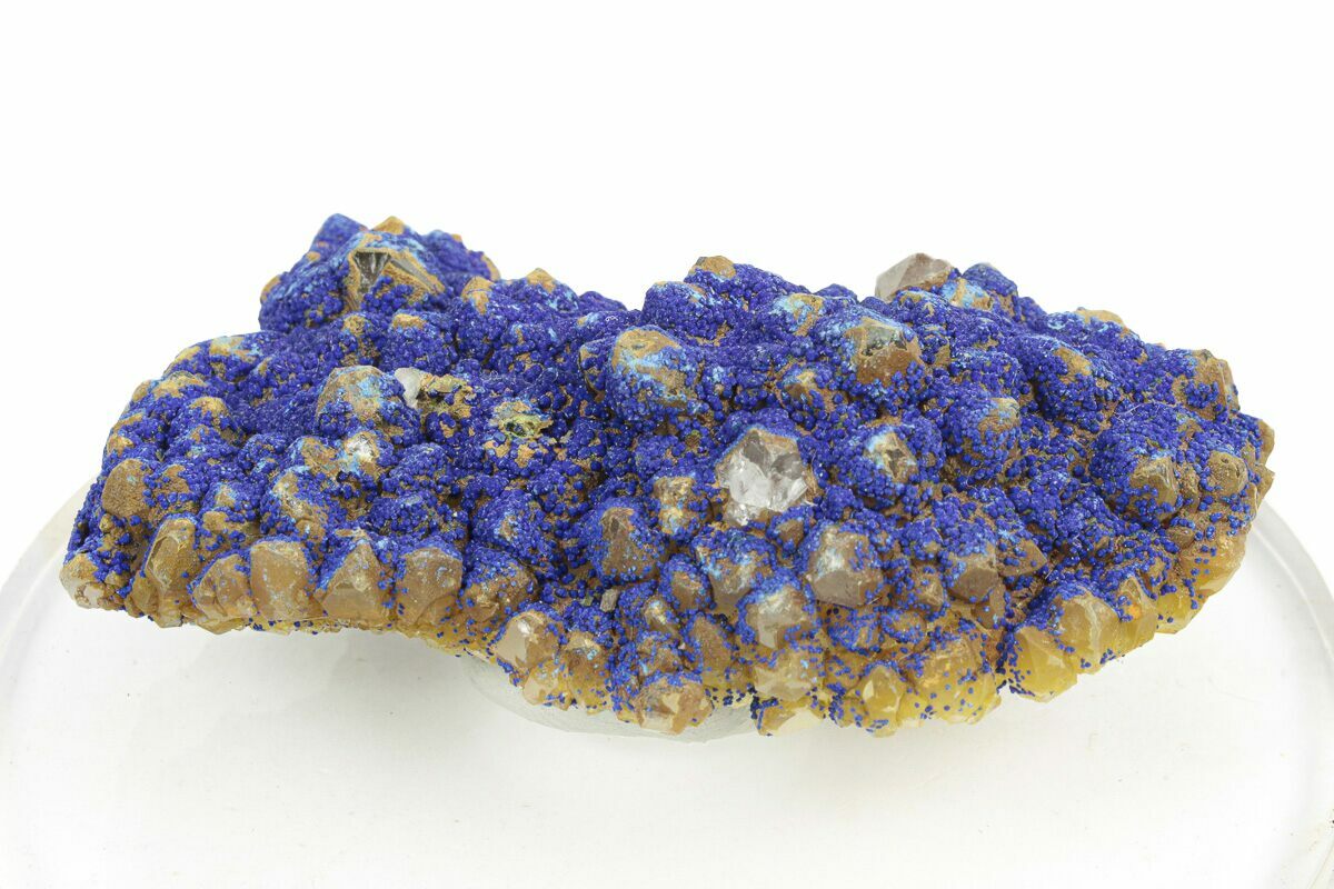 This specimen features botryoidal formations of incredibly blue azurite, all encrusted over a bed of quartz crystals. This colorful mineral association comes out of the Guizhou Province of China. It has been mounted to an acrylic display base with mineral tack.