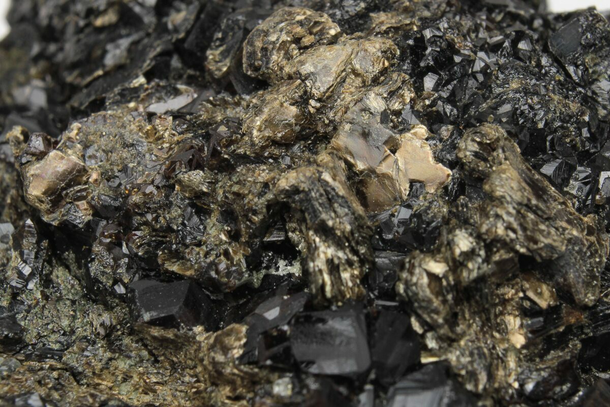 This garnet centered specimen comes from a location in Pakistan, where associations of deep orange/brown garnets, feldspar, golden mica, green epidote, calcite and albite are typically found. The garnets from this location display a unique pattern, which can be seen along the faces of the crystals when rotated under light.