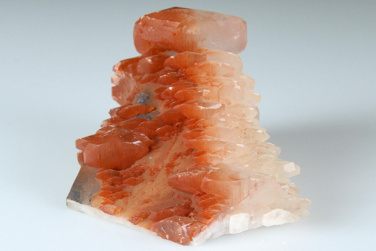 This is a fascinating cluster of lustrous "pagoda calcite" (also known as "mushroom calcite" and "poker chip calcite") crystals that formed over a scalenohedral calcite crystal. The pagoda-style calcite crystals contain hematite inclusions which give them their red coloration. This specimen was collected from the Fengjiashan Mine (Daye Copper mine) in the Hubei Province of China and under shortwave UV, they react by fluorescing a vibrant orange color.