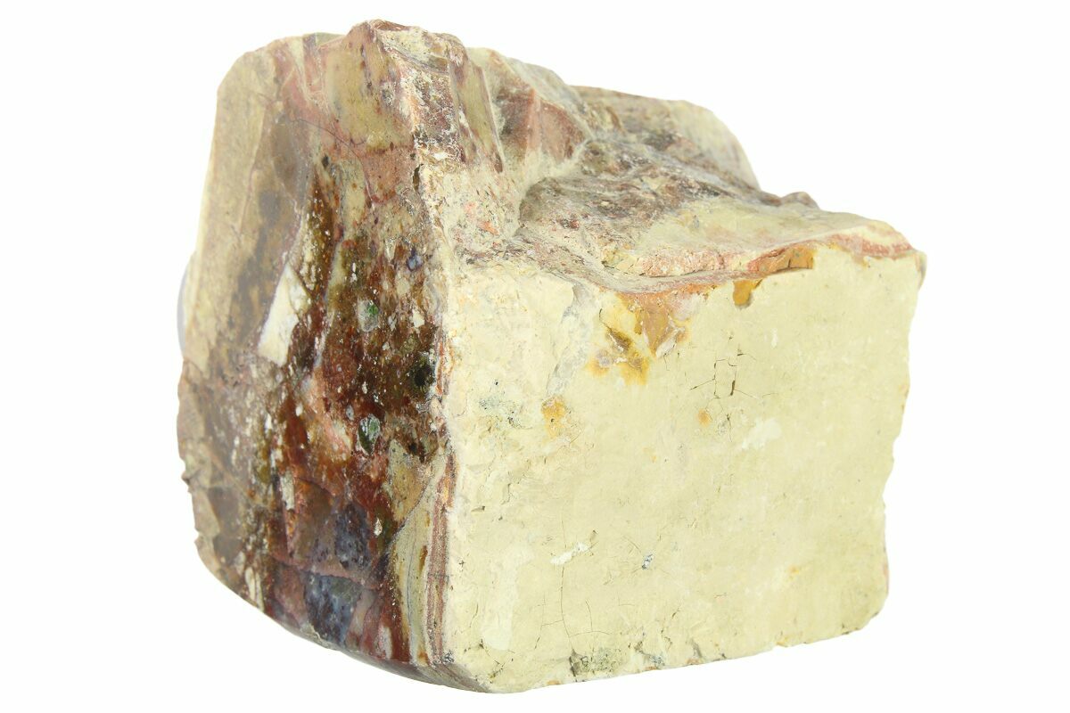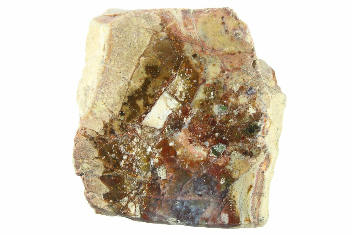 This is a beautiful, 2.5" wide section of Indonesian agate that was collected from Java, Indonesia. It features red, white, and blueish coloration, with native copper scattered throughout one side of the agate. It has been cut flat and polished to a glossy finish on two sides. This material is perfect for lapidary projects.