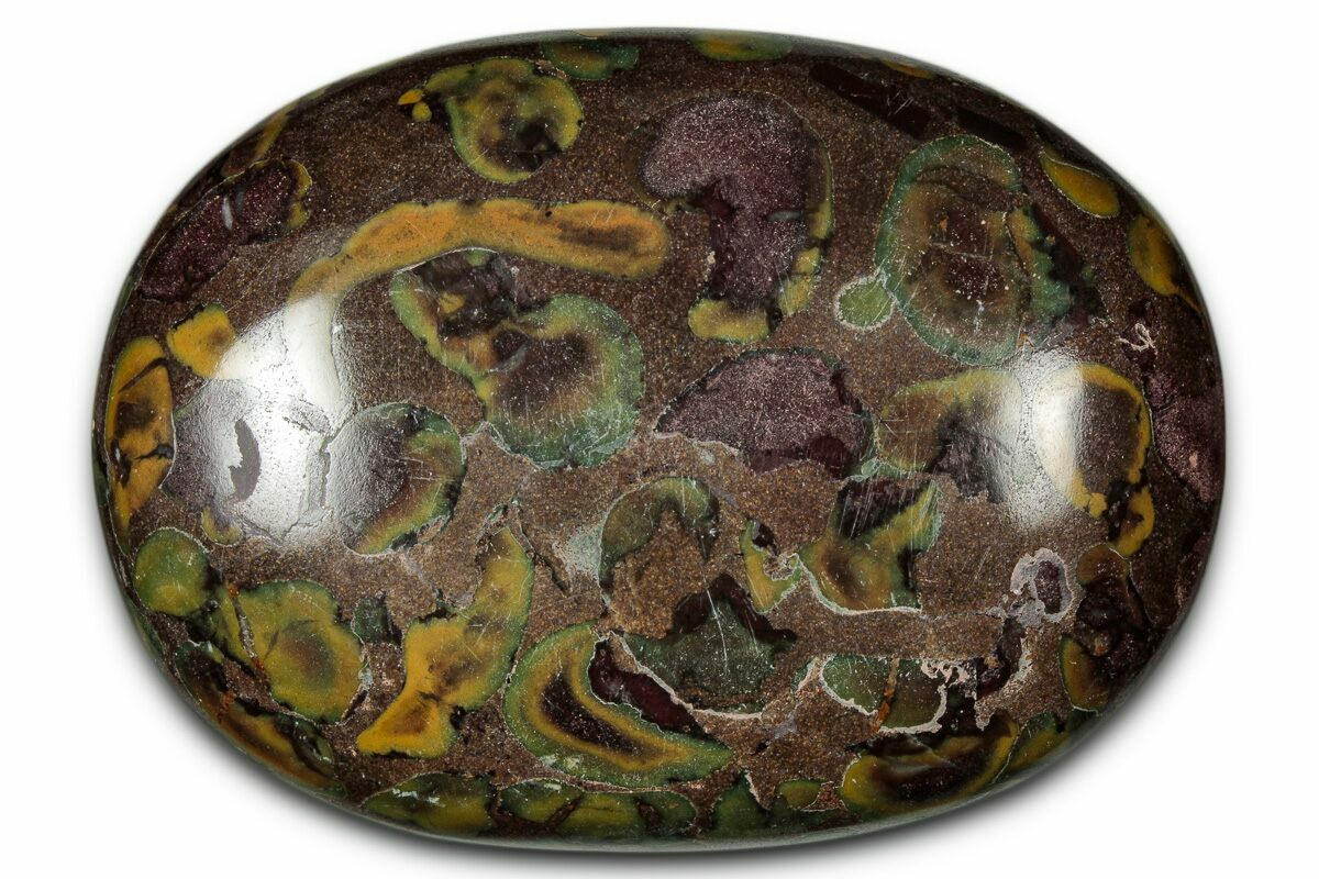 This is a beautifully polished, 2.5" wide fruit jasper palm stone, gleaming with warm hues and intricate natural patterning. Its smooth finish and eye-catching color palette make it a small yet stunning display piece.