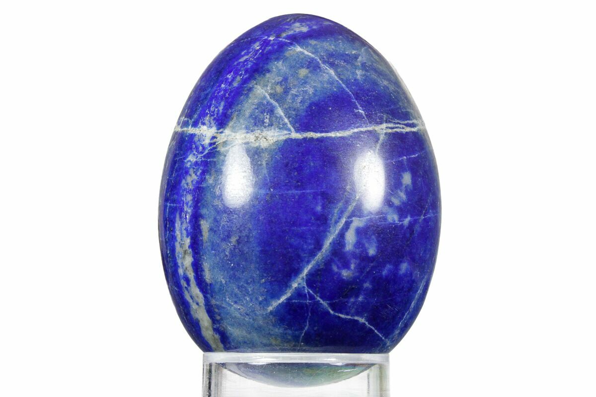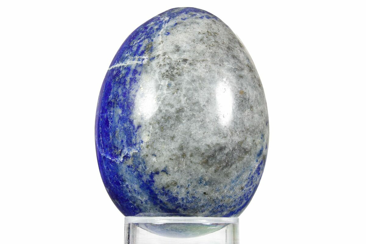 This is a 2.5" tall, polished lapis lazuli egg with streaks of sparkling pyrite running through it. The vibrant blue stone was mined from Northern Pakistan. It comes with the pictured display stand.