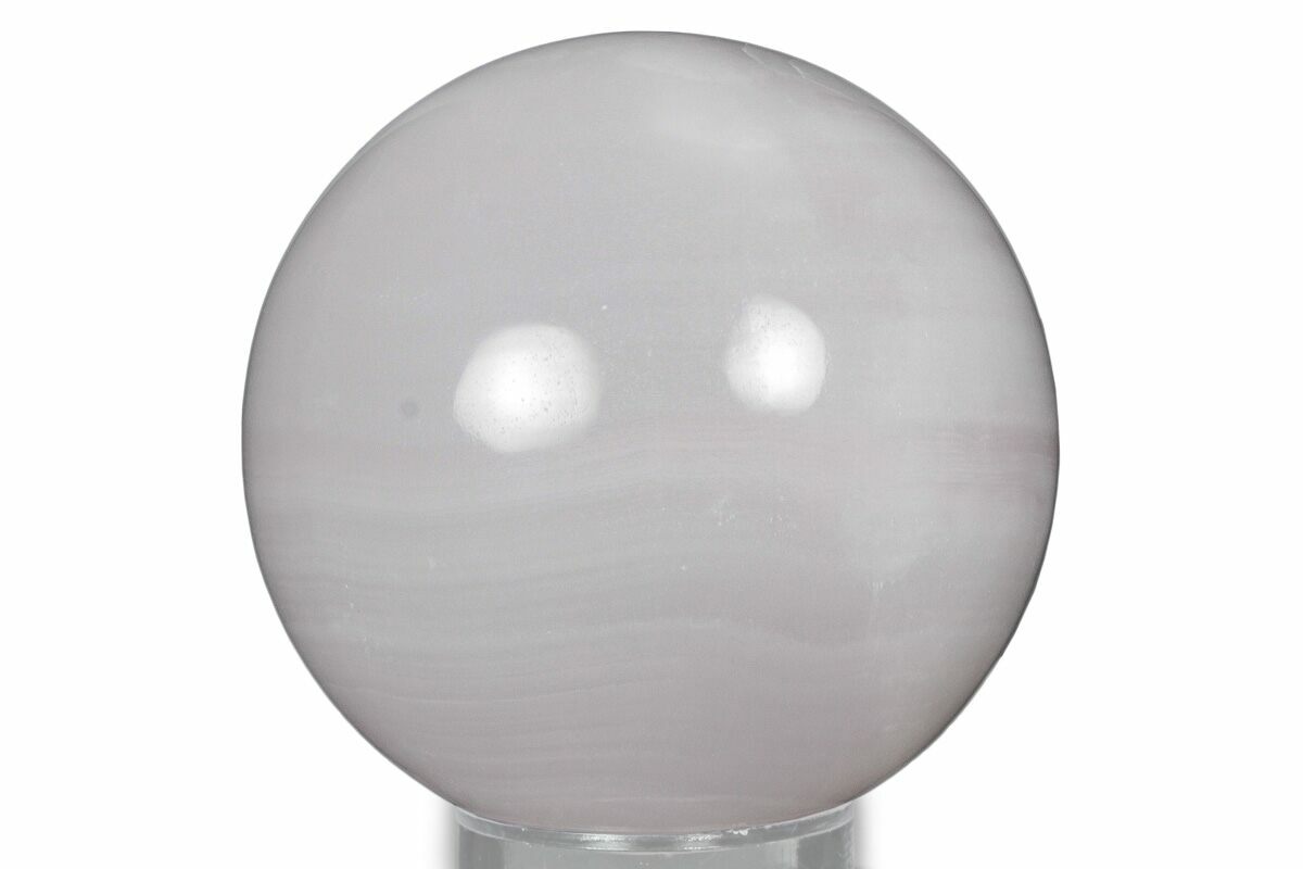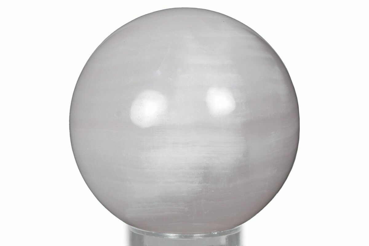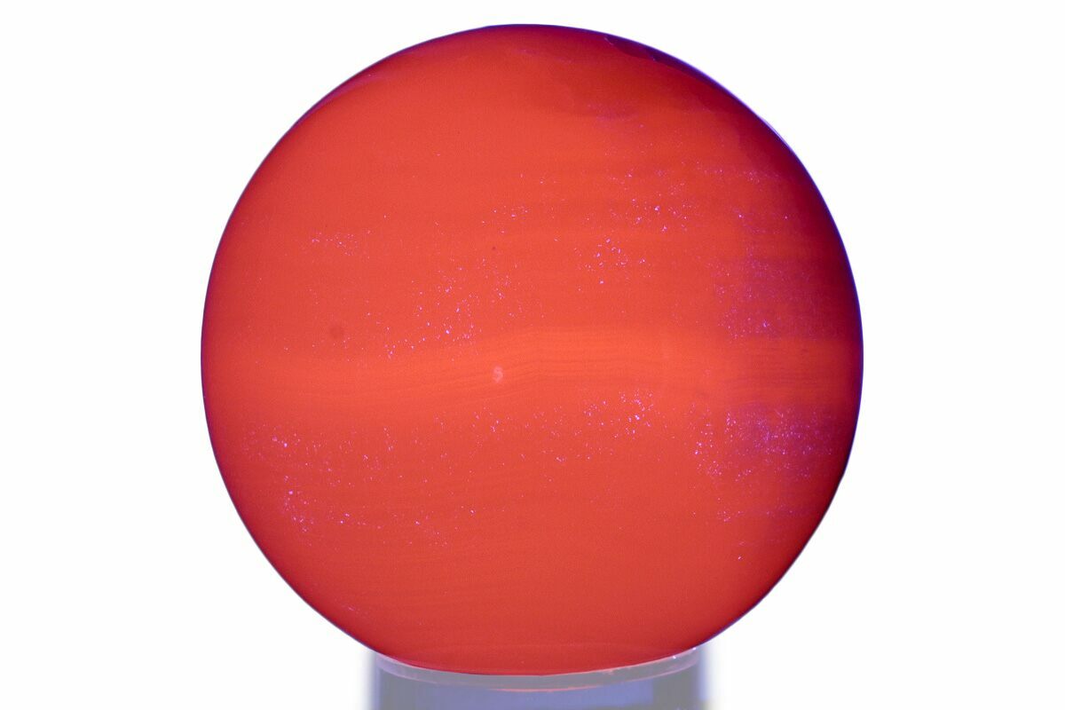 This is a gorgeous pink, 2.5" wide polished manganoan (mangano) calcite sphere. It has been expertly polished to a glossy finish all the way around, highlighting the natural banding of the mineral. This calcite exhibits an intense orange fluorescence under shortwave UV light.