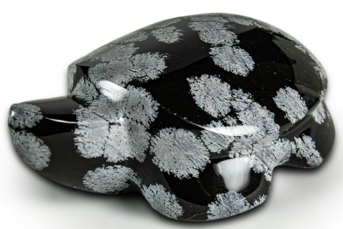 This is a 2.5" long turtle sculpted from snowflake obsidian, collected near Sevier Lake in Millard County, Utah. The obsidian has been flawlessly polished to a glossy finish.