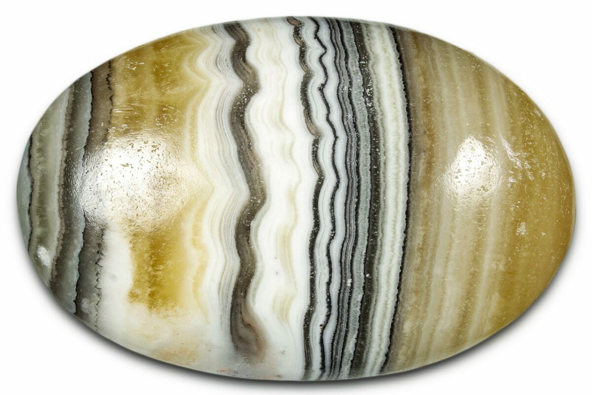 This is a 2.5" wide polished palm stone of banded zebra calcite from Nuevo León, Mexico, expertly polished to reveal its striking natural striping.