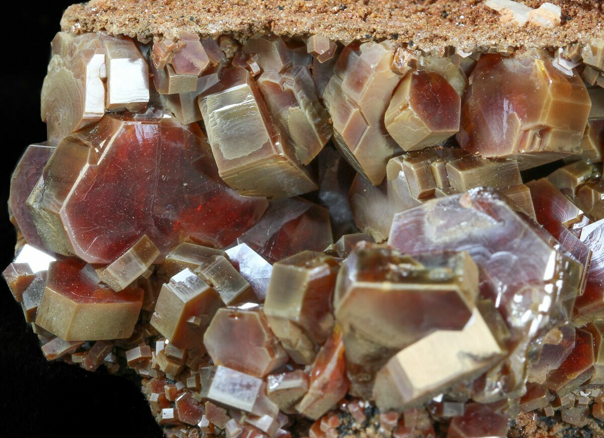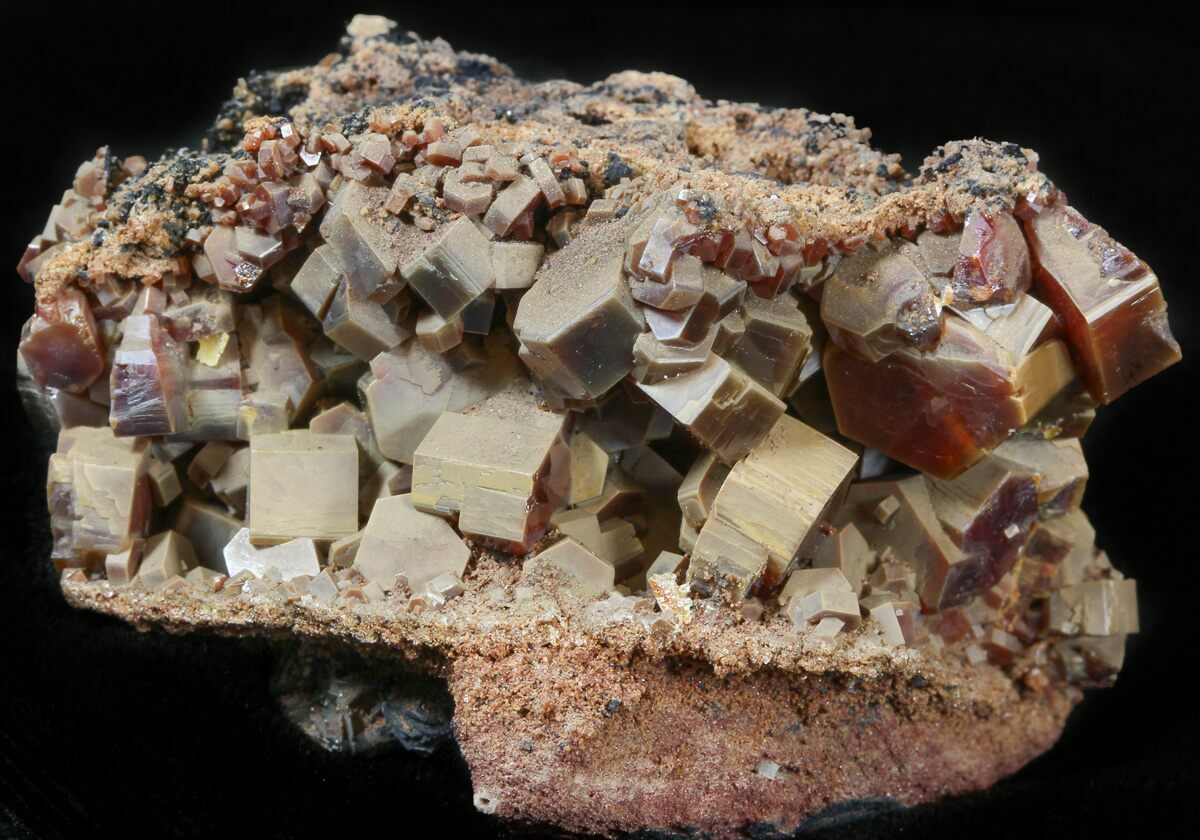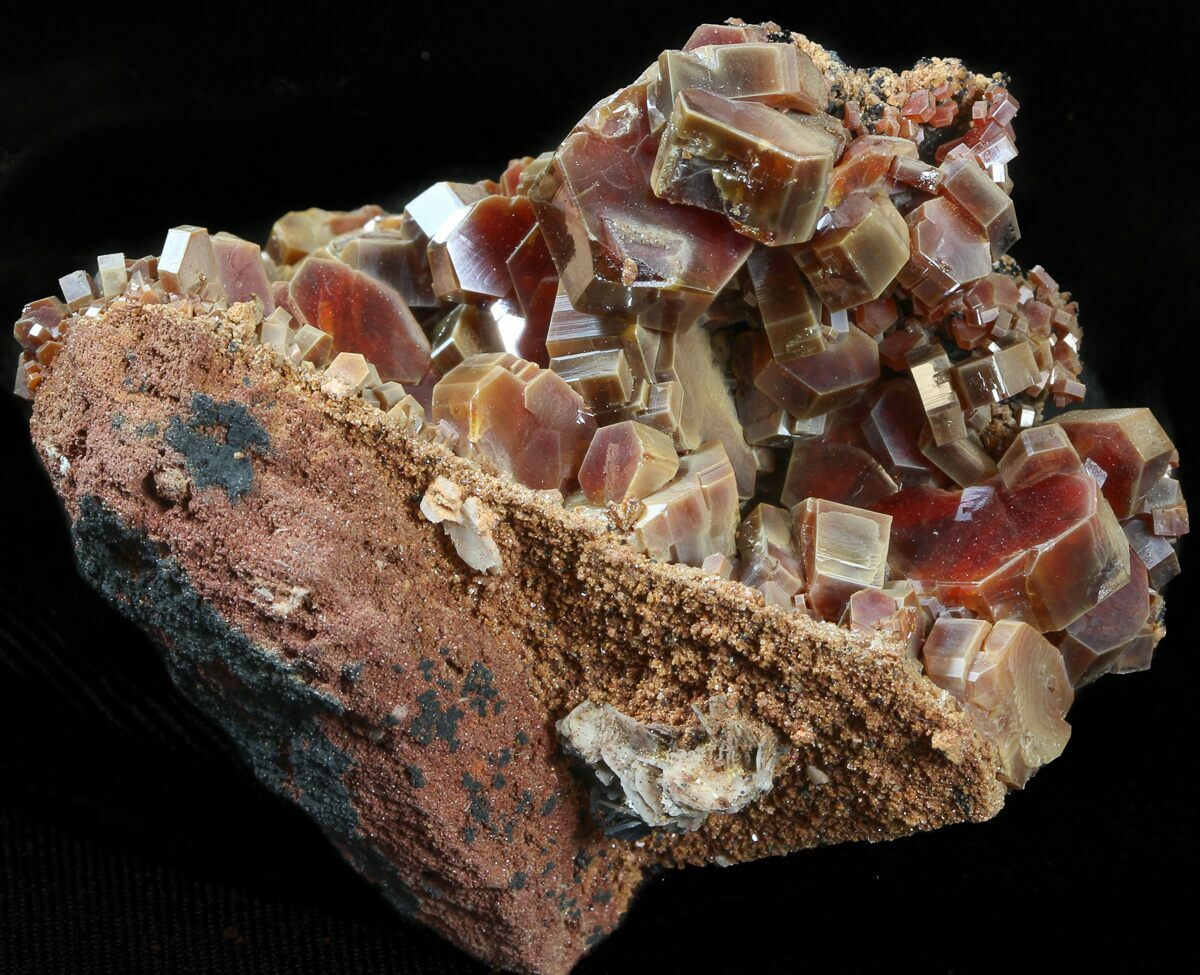 This is a beautiful grouping of large deep red and light brown, vanadinite crystals from Midelt, Morocco. They exhibit excellent color saturation, and a mirror luster on an iron-rich matrix. This specimen is a cluster of hundreds of both small and large, high quality crystals.
