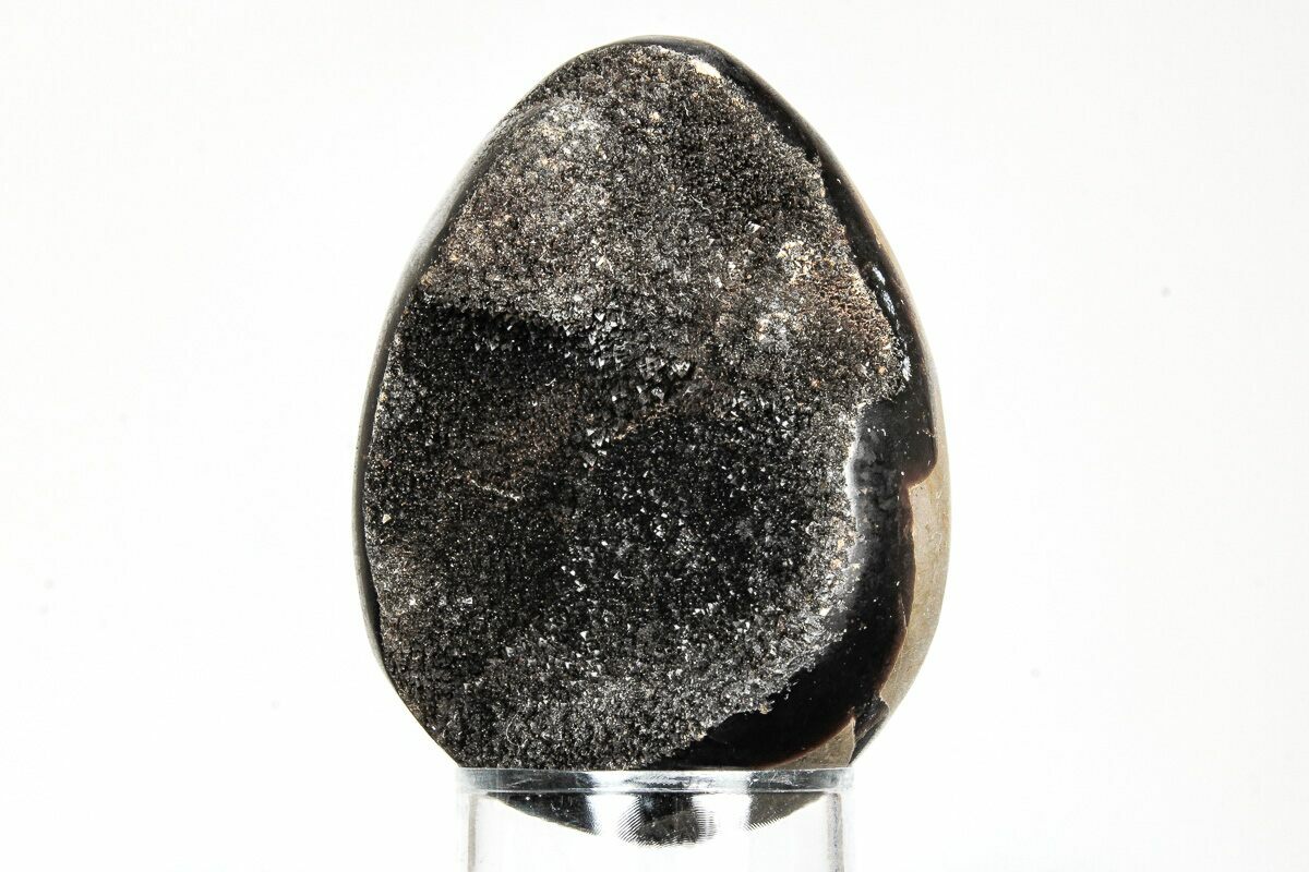 This is a really cool Septarian "Dragon Egg" geode collected in the Betsiboka Region of Madagascar. The hollow cavity is full of beautiful, black calcite crystals. It is a hollow septarian nodule, which has been polished into an egg shape, and the natural cracked pattern of the septarian gives it the appearance of a dragons egg. A spectacular display piece which would look great in your home/office or make a great gift for the Game of Thrones enthusiast you know.
