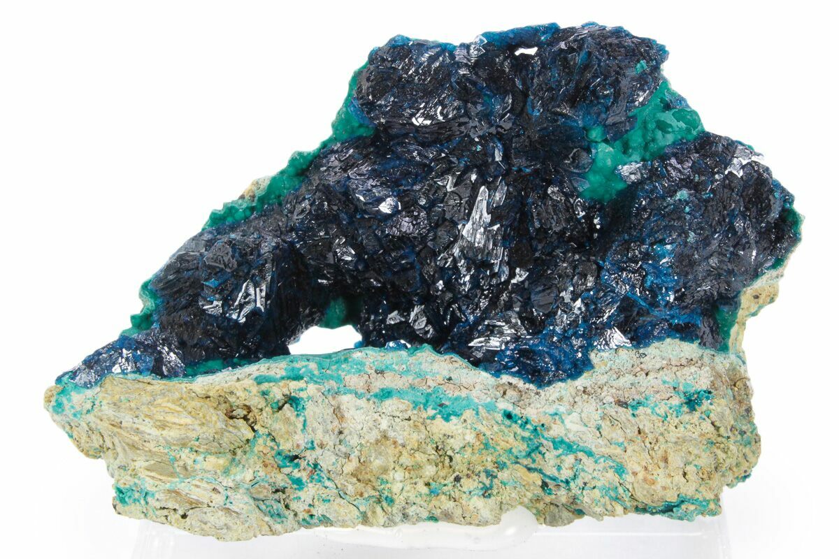 This is an absolutely stunning, 2.5" wide cluster of sparkling, deep blue veszelyite crystals that formed over blue-green zincolibethenite. It was collected from the hemimorphite zone of the Palabanda Quarry in the Republic of the Congo (Brazzaville).