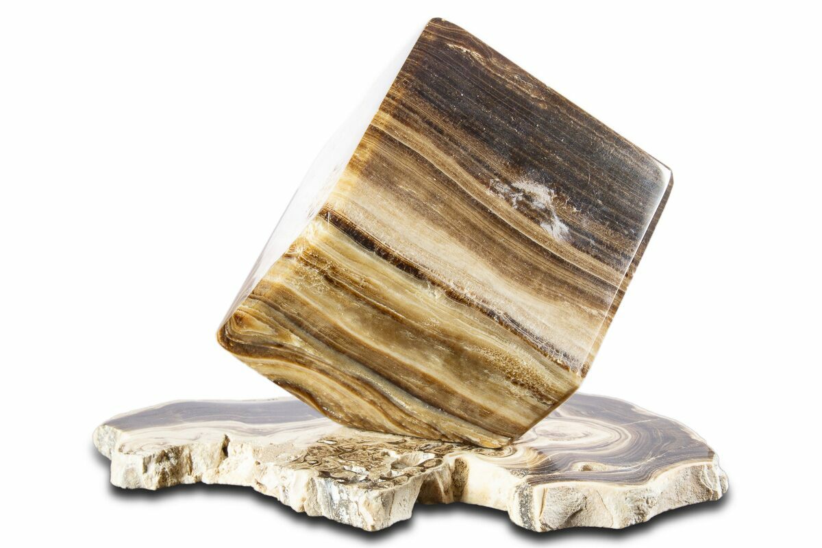 This is a 2.5" wide, polished chocolate calcite cube. One corner is cut so that it displays free standing on a hard surface. It comes a separate, polished calcite slab that acts as a wonderful display base.