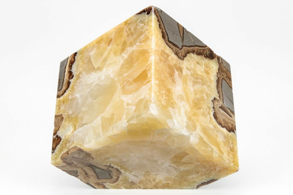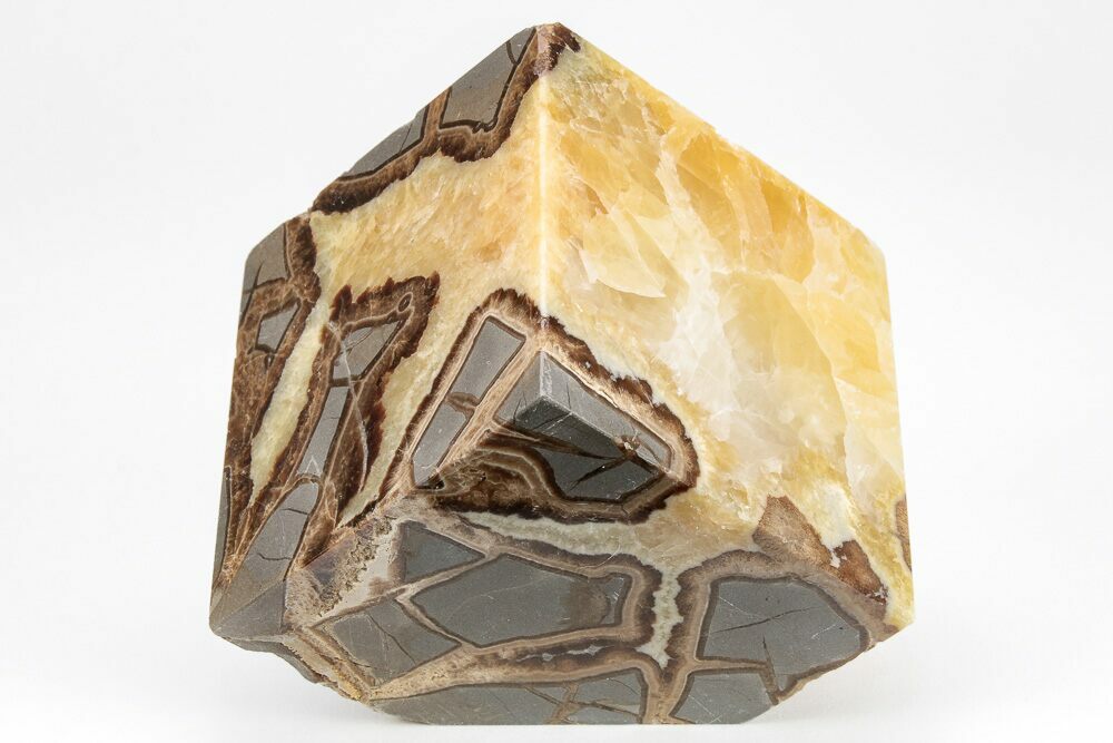This is a stunning, 2.5" wide, cut and polished cube of septarian. This septarian was mined West of Orderville, Utah and was deposited during the Late Cretaceous, about 94 million years ago. The contrast between the grey limestone, yellow calcite and brown aragonite is quite stunning. One corner is cut so that it displays nicely on a hard surface.